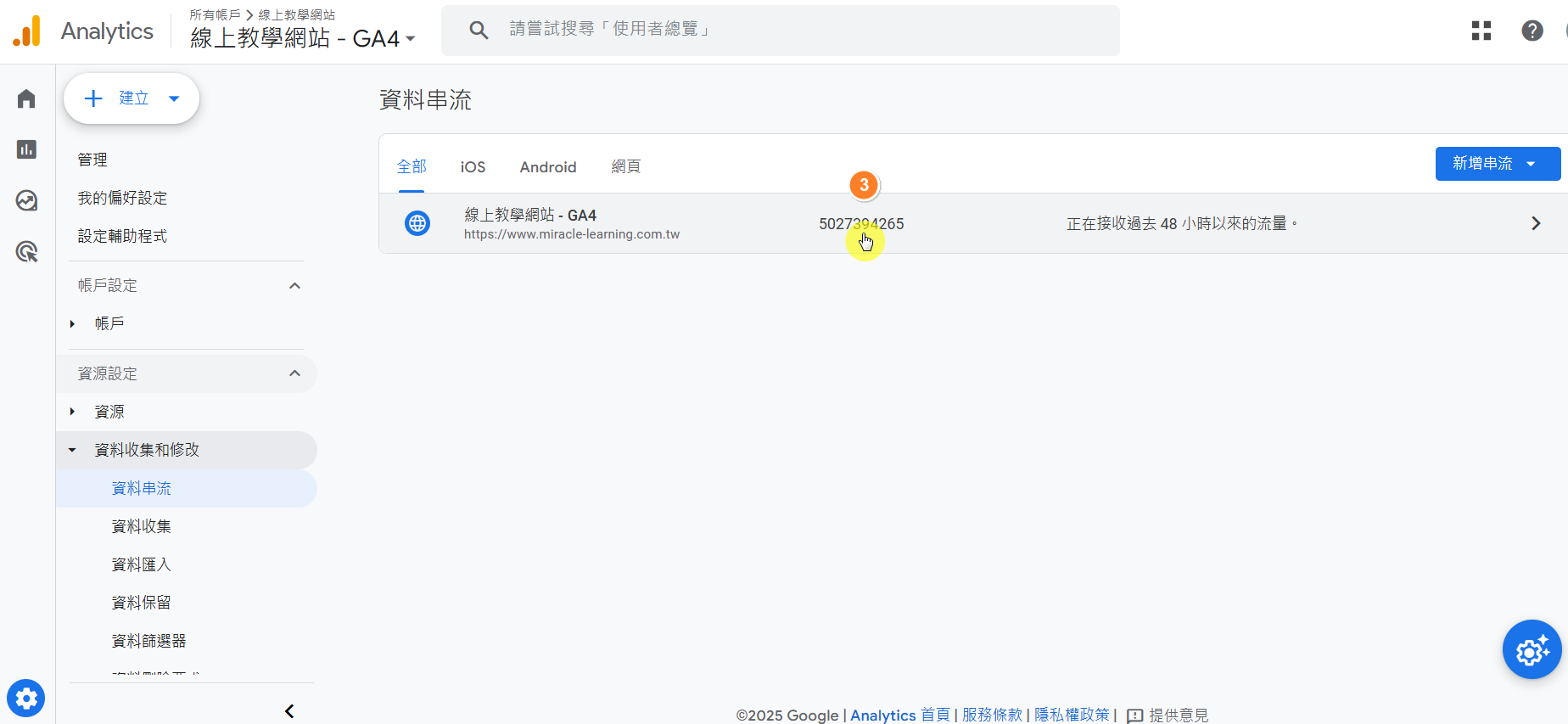 在「資源設定」>「資料收集和修改」>點選「資料串流」。