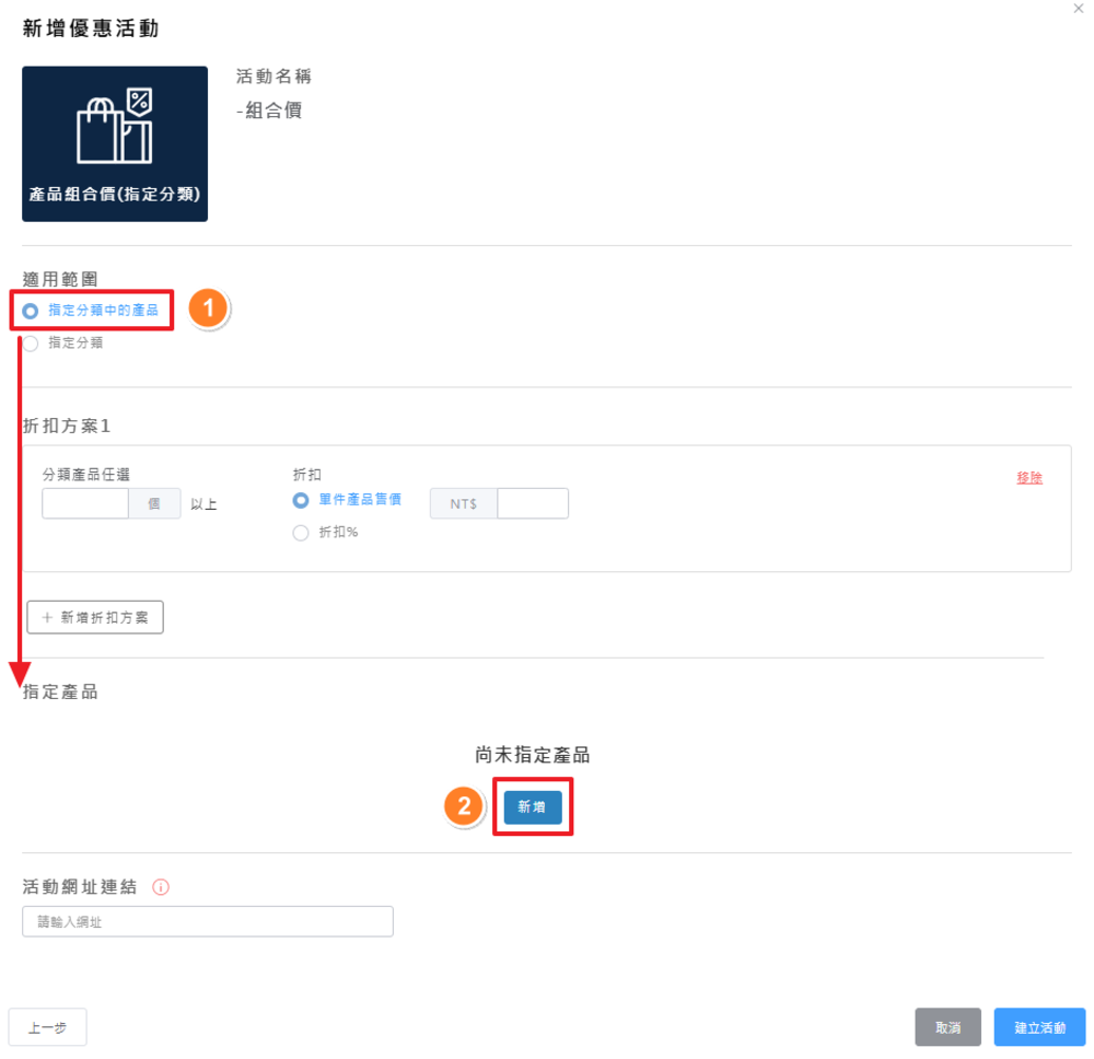 過去店家想要進行產品組合優惠活動時,只能設定「指定分類」中的全部商品,讓活動規劃增添許多限制,同時無法靈活操作。 備註: