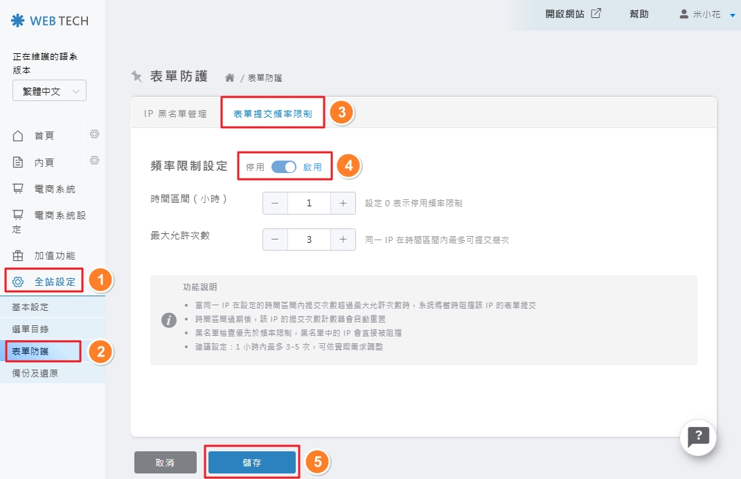🚀 管理路徑: 全站設定 ❯ 表單防護 ❯ 表單提交頻率限制