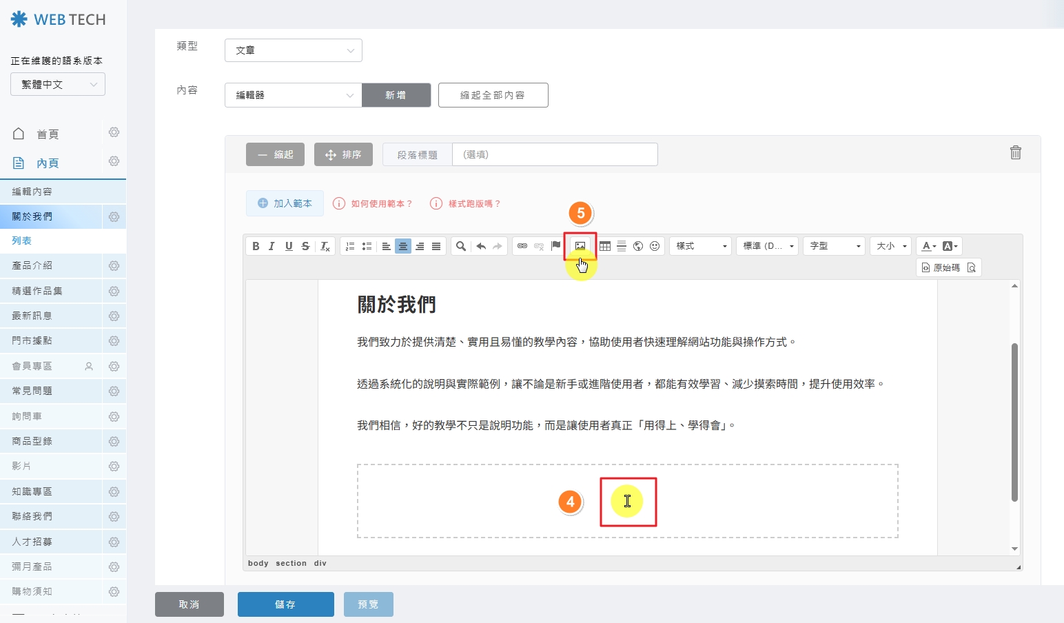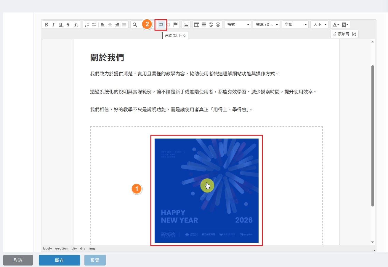 本篇教學文章將指導您如何在內容區塊中插入圖片、設定超連結,以及正確刪除圖片的標準流程。