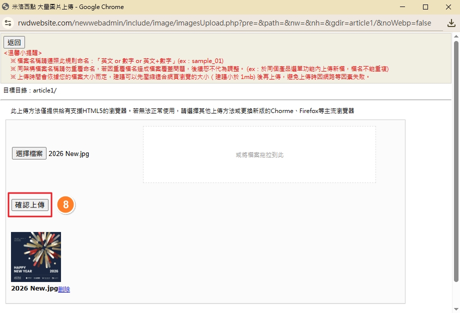 🚀 操作路徑: 點選「上傳圖片」❯選擇檔案❯點選圖片來源❯確認上傳資料庫❯在資料庫中點選「欲使用的圖片」❯在編輯器中成功插入
