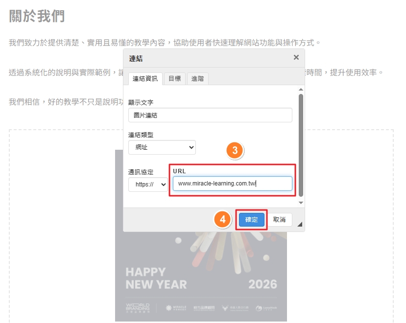 🚀 操作路徑: 在「連結」視窗 ❯ 點選「連結資訊」頁籤 ❯ 輸入「達頁面的網址」 ❯ 確定