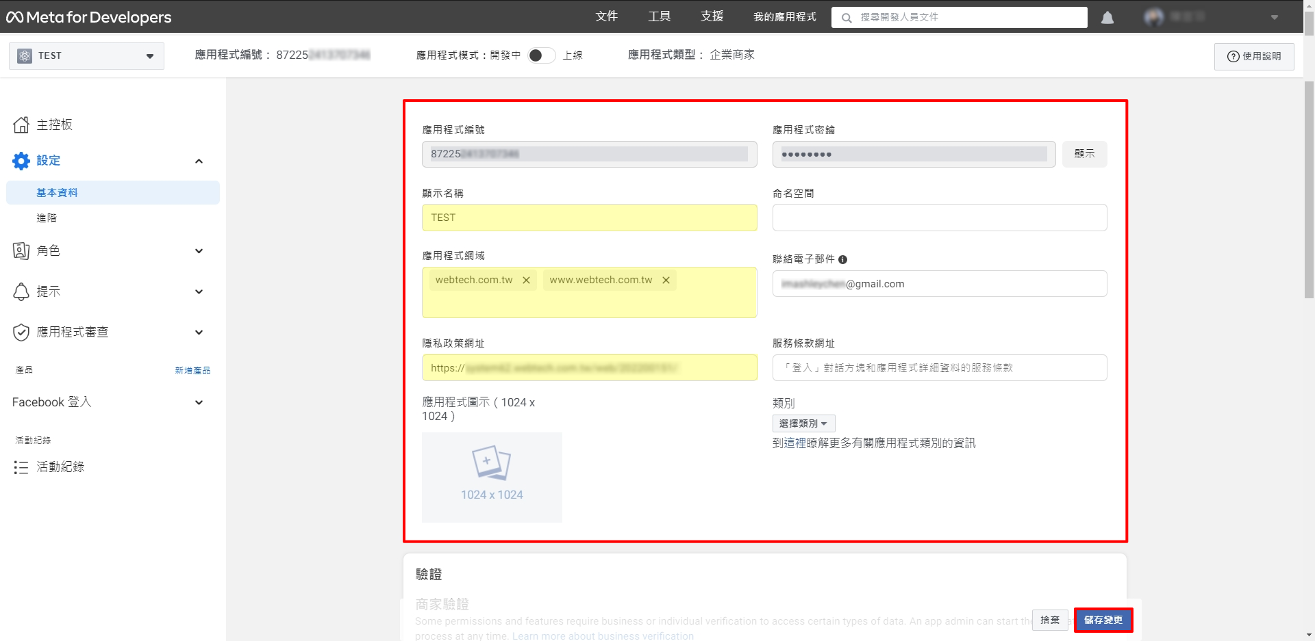STEP 8:點選《左側主選單》「設定」中的>「基本資料」,並依序填寫【應用程式網域】、【隱私政策網址】