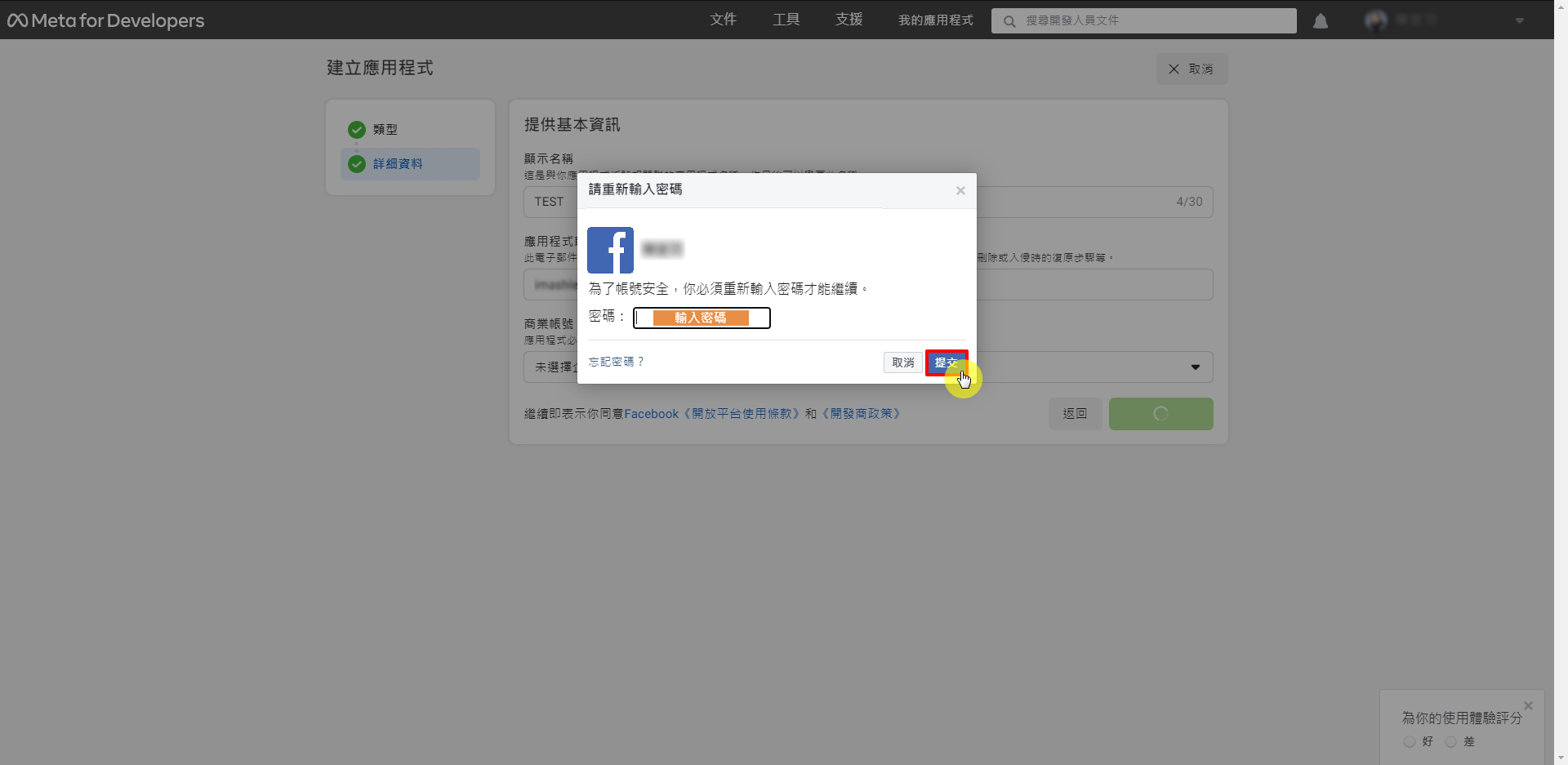 ※ 點選後出現Facebook「安全驗證」的彈跳視窗,請輸入Facebook密碼,後點選右下角「提交」並完成驗證