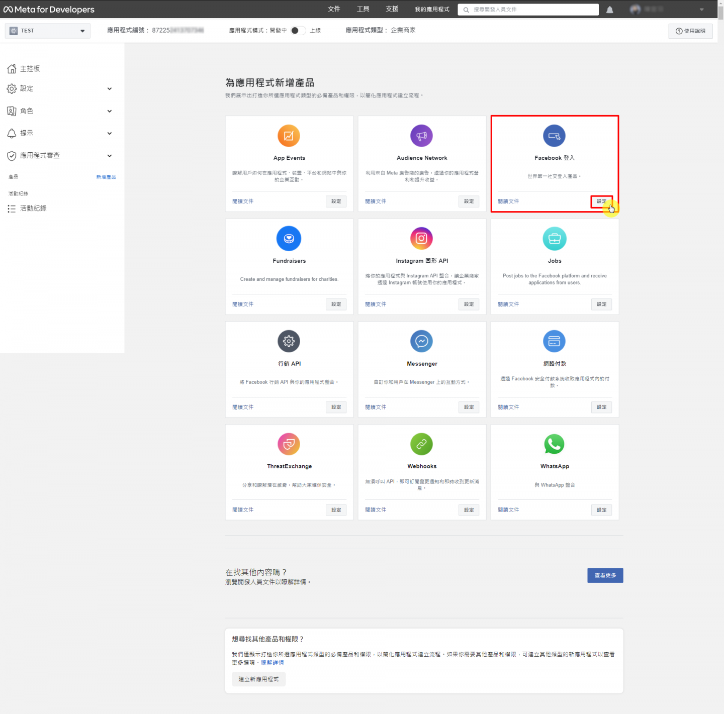 STEP 5 :找到「Facebook登入」選項如下,並點選「設定」