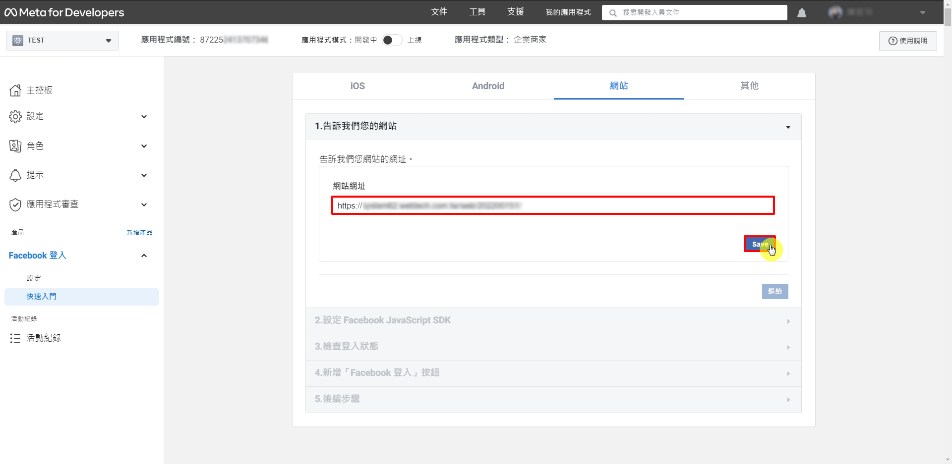STEP 7:貼上您的「網站網址」,按下「Save」,接著請點擊繼續,參閱文件說明直至最底頁