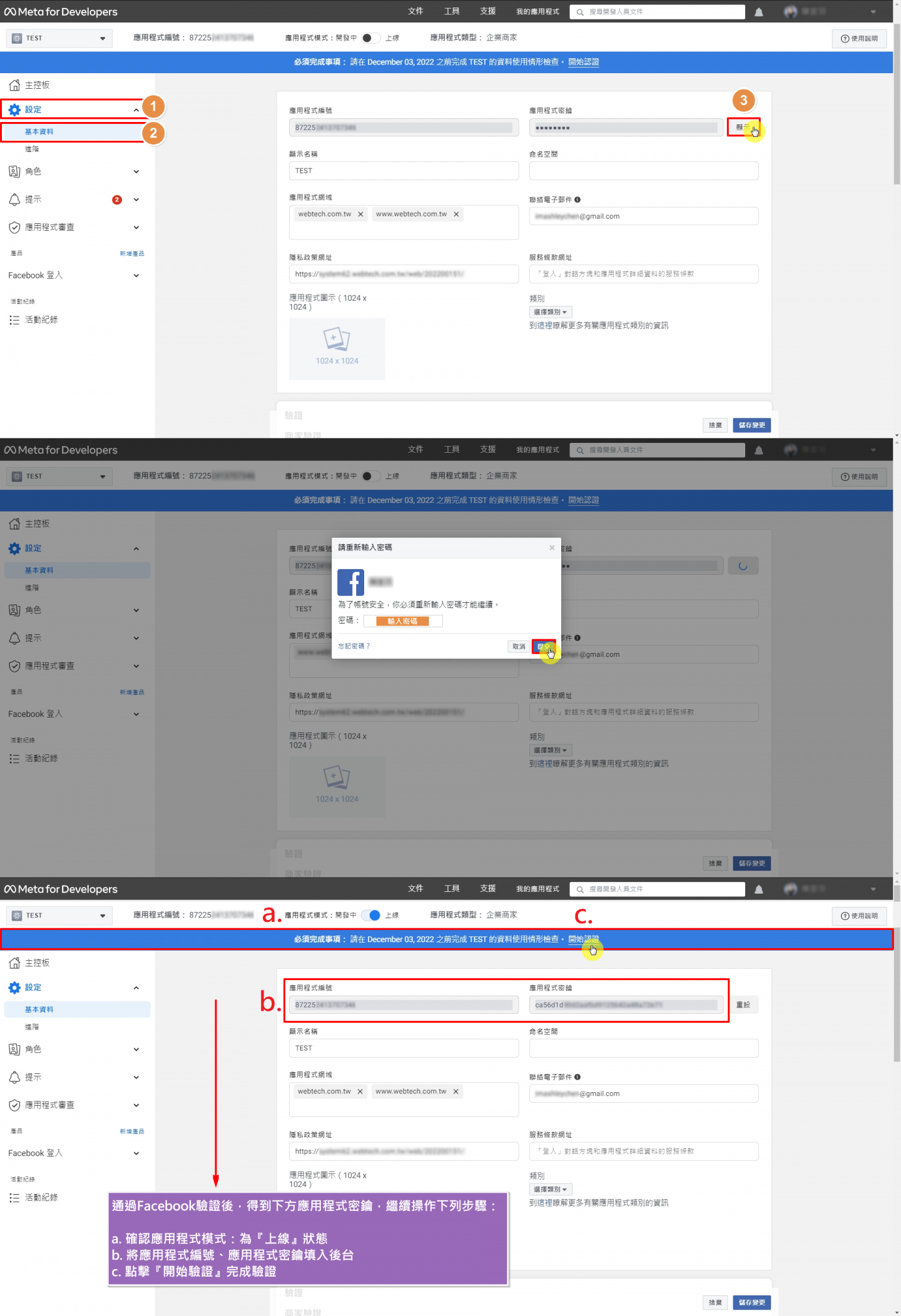 STEP 12:點選《左側主選單》「設定」中>「基本資料」,點擊「顯示」,出現Facebook「安全驗證」視窗,輸入Facebook密碼完成驗證後,將會得到●●●●●●●轉為正常英、數字顯示,此時將「應用程式編號」及「應用程式密鑰」,貼至米洛後台串接,並確認下方步驟即可完成囉!