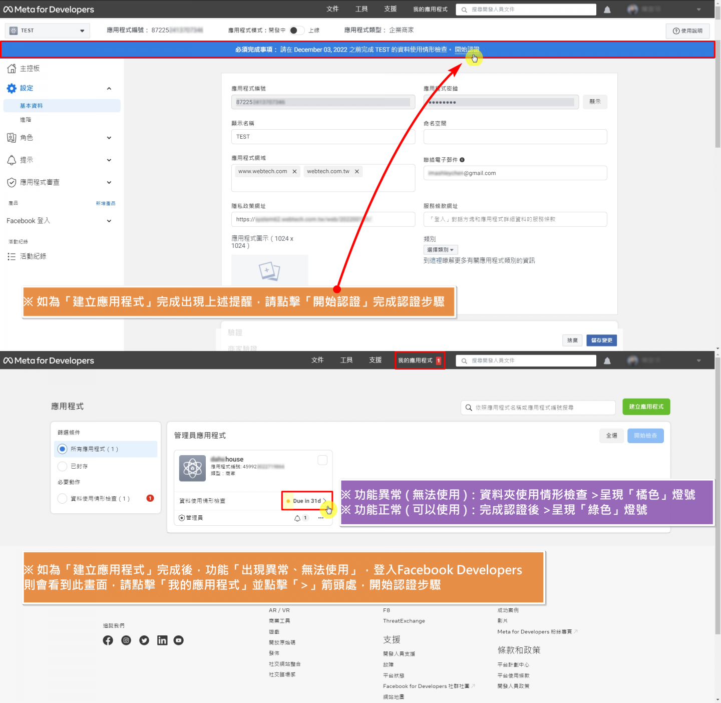 ※ 請注意:串接完成後,請務必留意您的『Facebook登入應用程式權限』、『使用情況』,Facebook 會不定期發出通知、資料審核的訊息,請於期限內回覆Facebook,以免應用程式遭Facebook 停用。(可滑至最底部確認資訊、或參考「頁籤」教學說明,進行檢查與完成認證)