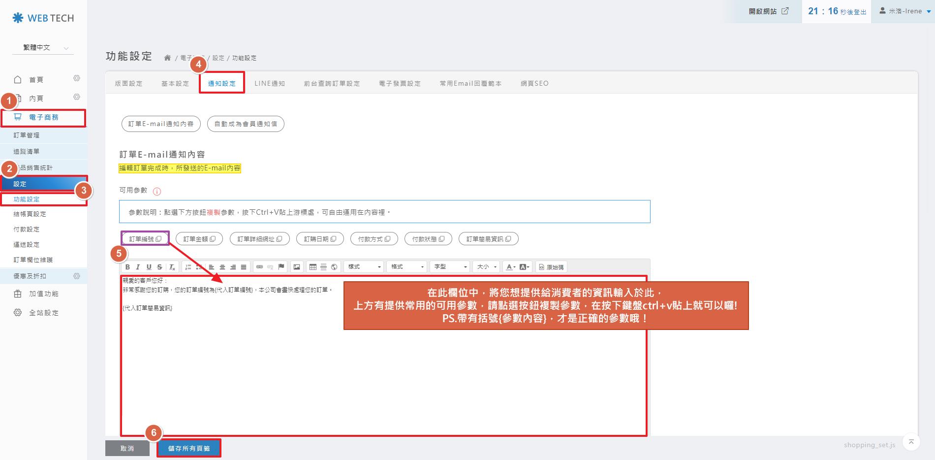 點擊電子商務>設定>功能設定>通知設定頁籤,並於訂單e-mail通知欄位輸入內容以及想帶入的參數設定。