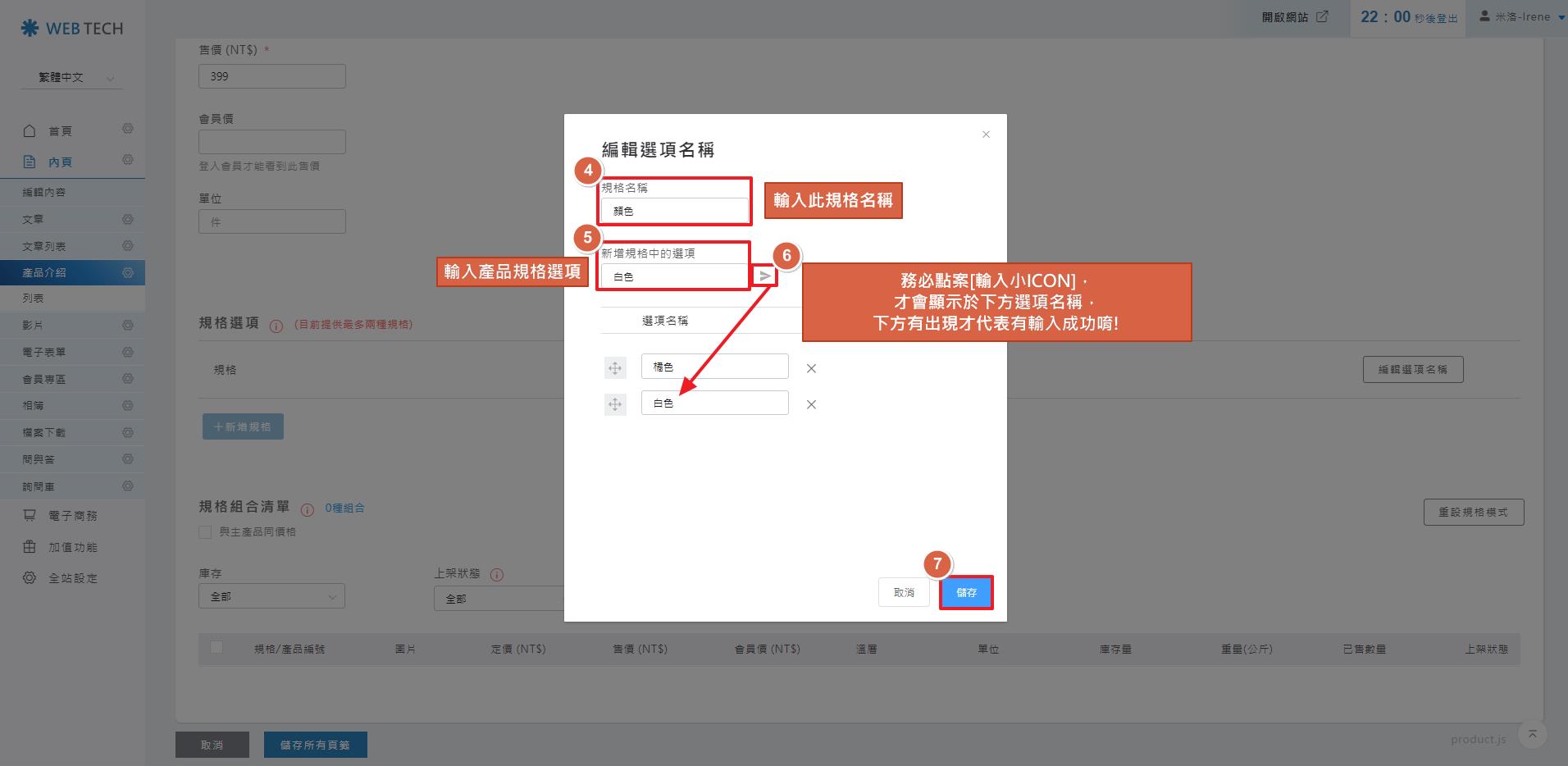 接下來,還需要至規格的部分進行設定,於前台才會顯示價錢的欄位顯示哦!請參考下方說明: