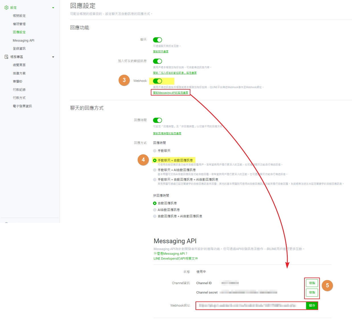 ※ 確認於『LINE官方管理平台』中已有開啟『聊天機器人』,並啟用『Webhook』
