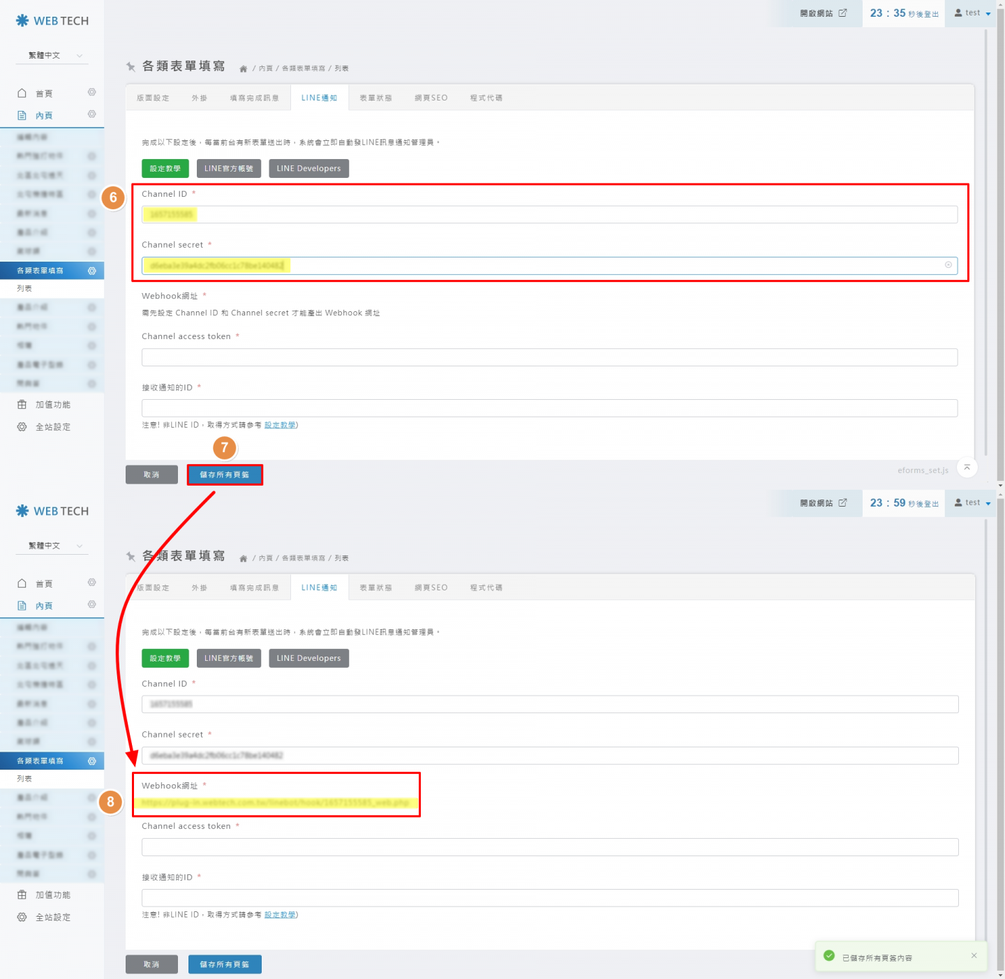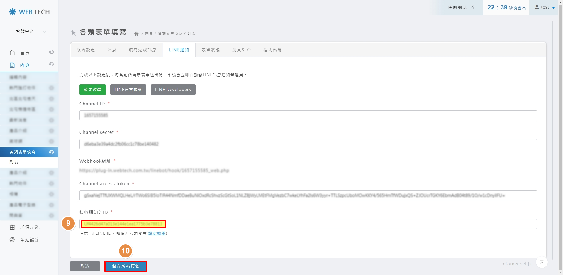 STEP 6:回到後台後→選擇『電子表單填寫』→選擇『LINE 通知』頁籤,將複製好的 Channel ID、Channel secret 代碼貼到下方紅色框起處, 並點選→『儲存所有標籤』