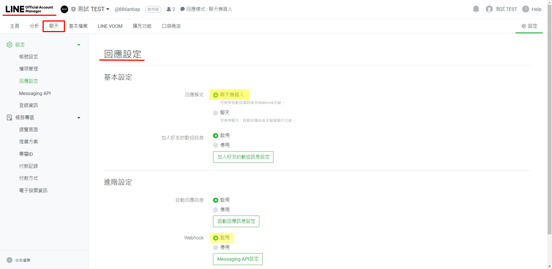 確認於『LINE官方管理平台』中已有開啟『聊天機器人』,並啟用『Webhook』