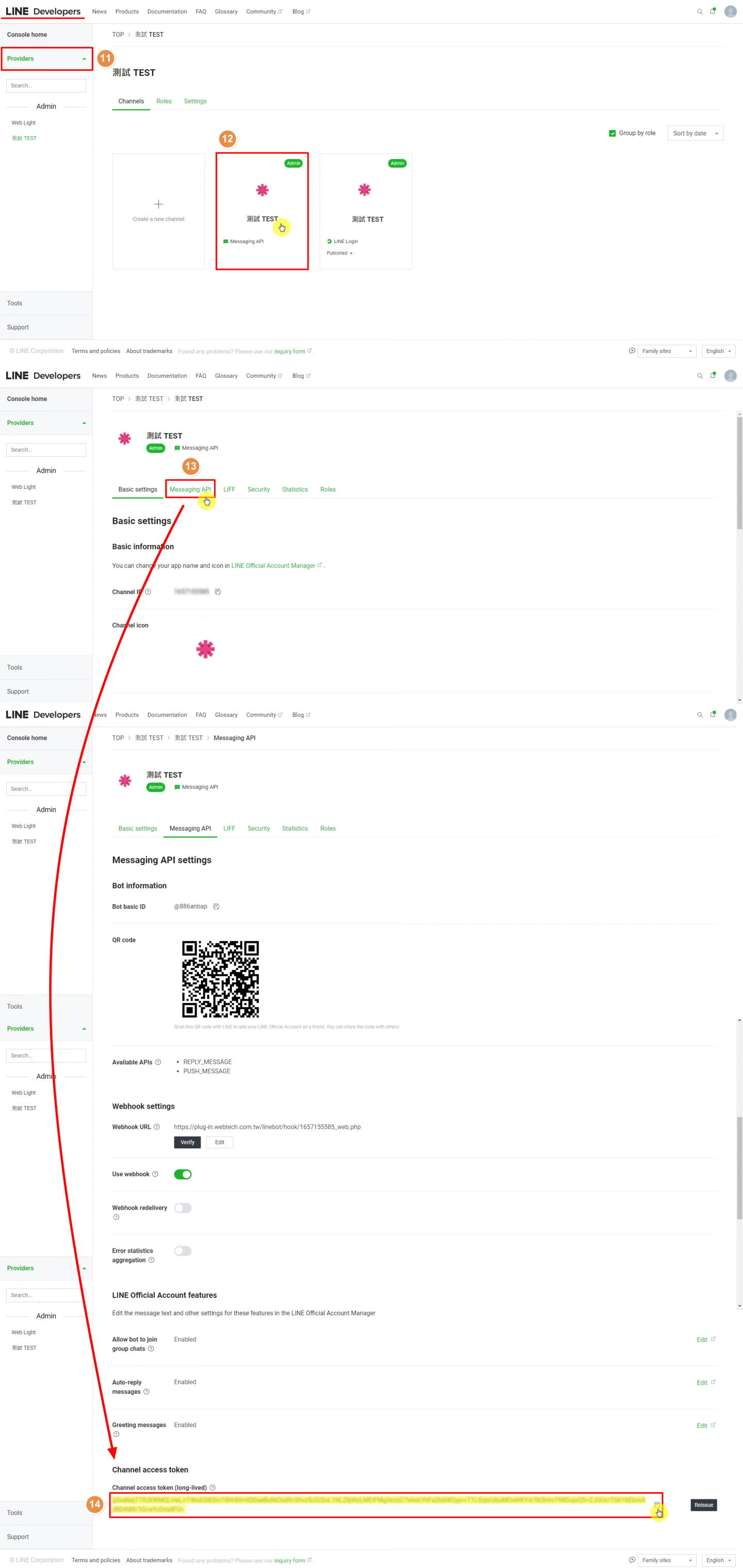 STEP 3~5:如要設置通知發到『個人-LINE帳號』,進到『LINE Developers』中,同上列步驟選擇對應的『Providers』,進入後,選擇『Messaging API』頁籤,使用『 Bot basic ID』 或『 QR code』 掃碼方式,到LINE中加入好友