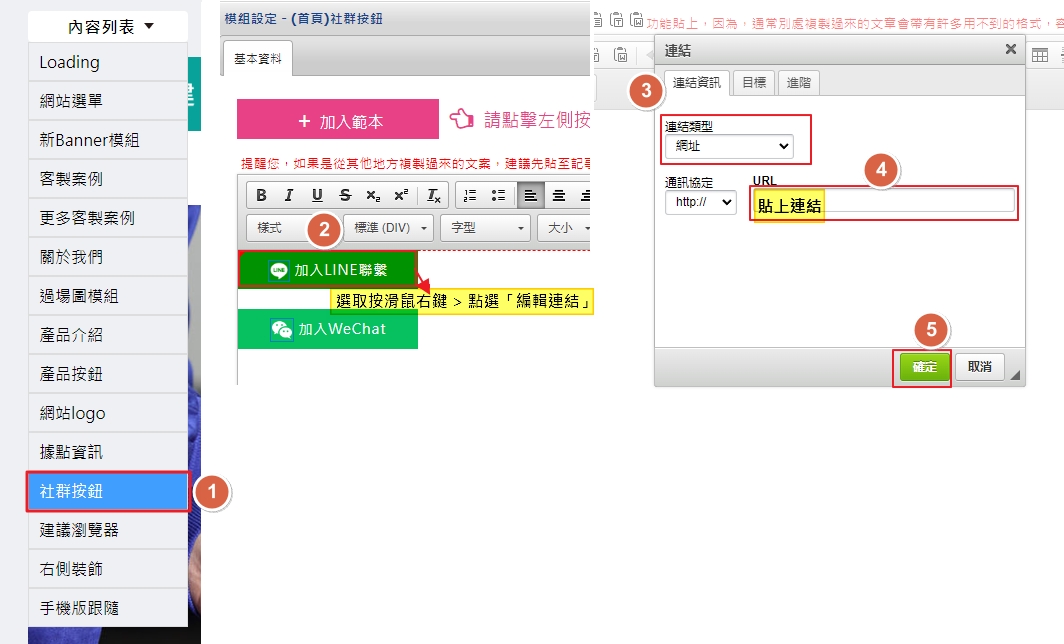 點選需更換連結之按紐 > 點選滑鼠右鍵>編輯連結>連結資訊>連結類型:網址>URL:貼上連結>確定>存檔,完成編輯。