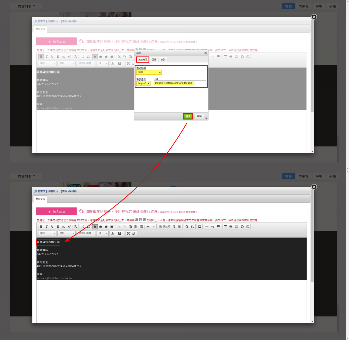 (範例:tel:04-2325-0777,填入後點選「確定」,即可完成設置超連結