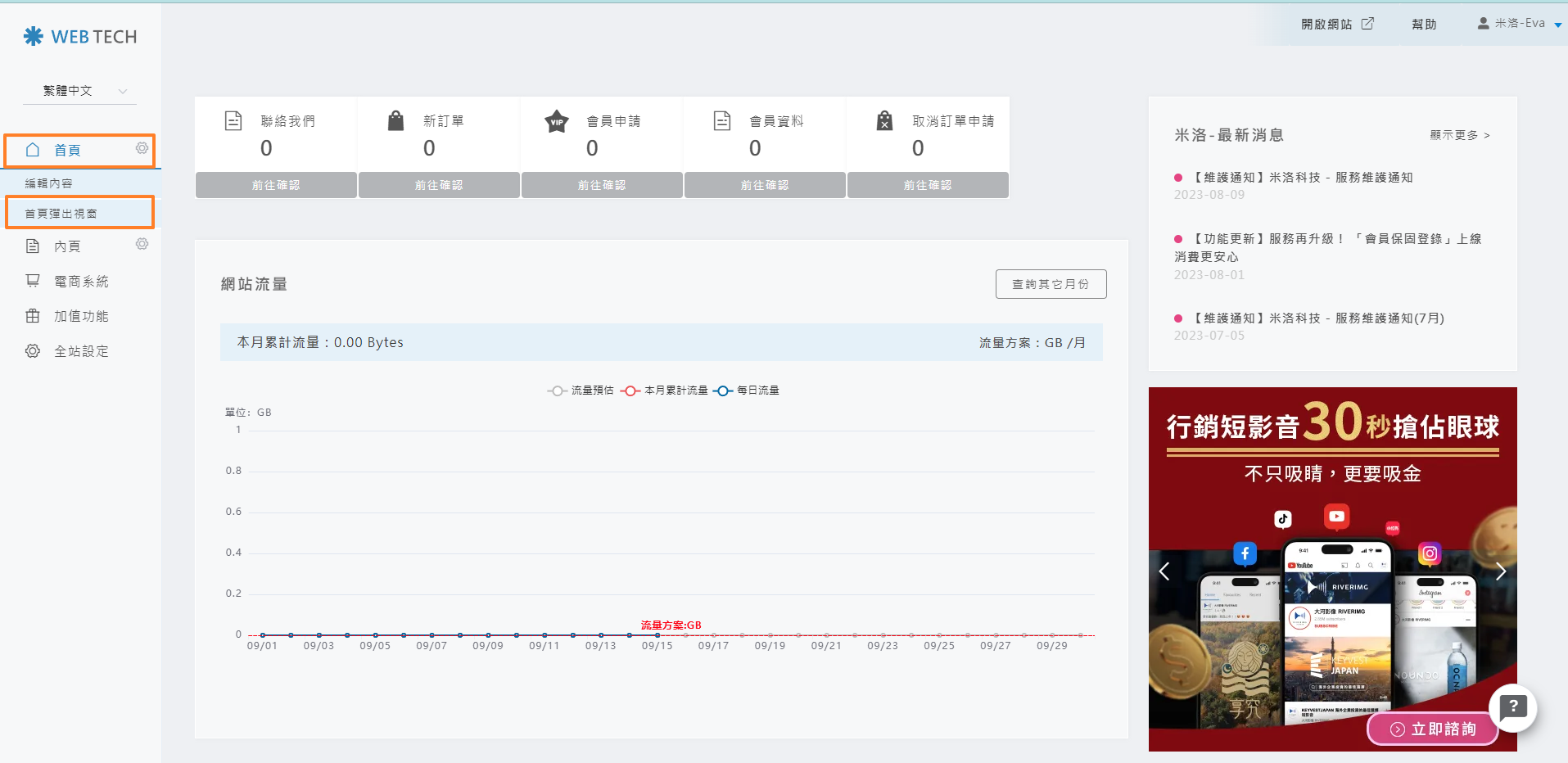 ● 電商系統:適用於有開放購物功能的網站才會有的功能選單,若您的網站是純形象網站,未販售產品的話則不會出現。
