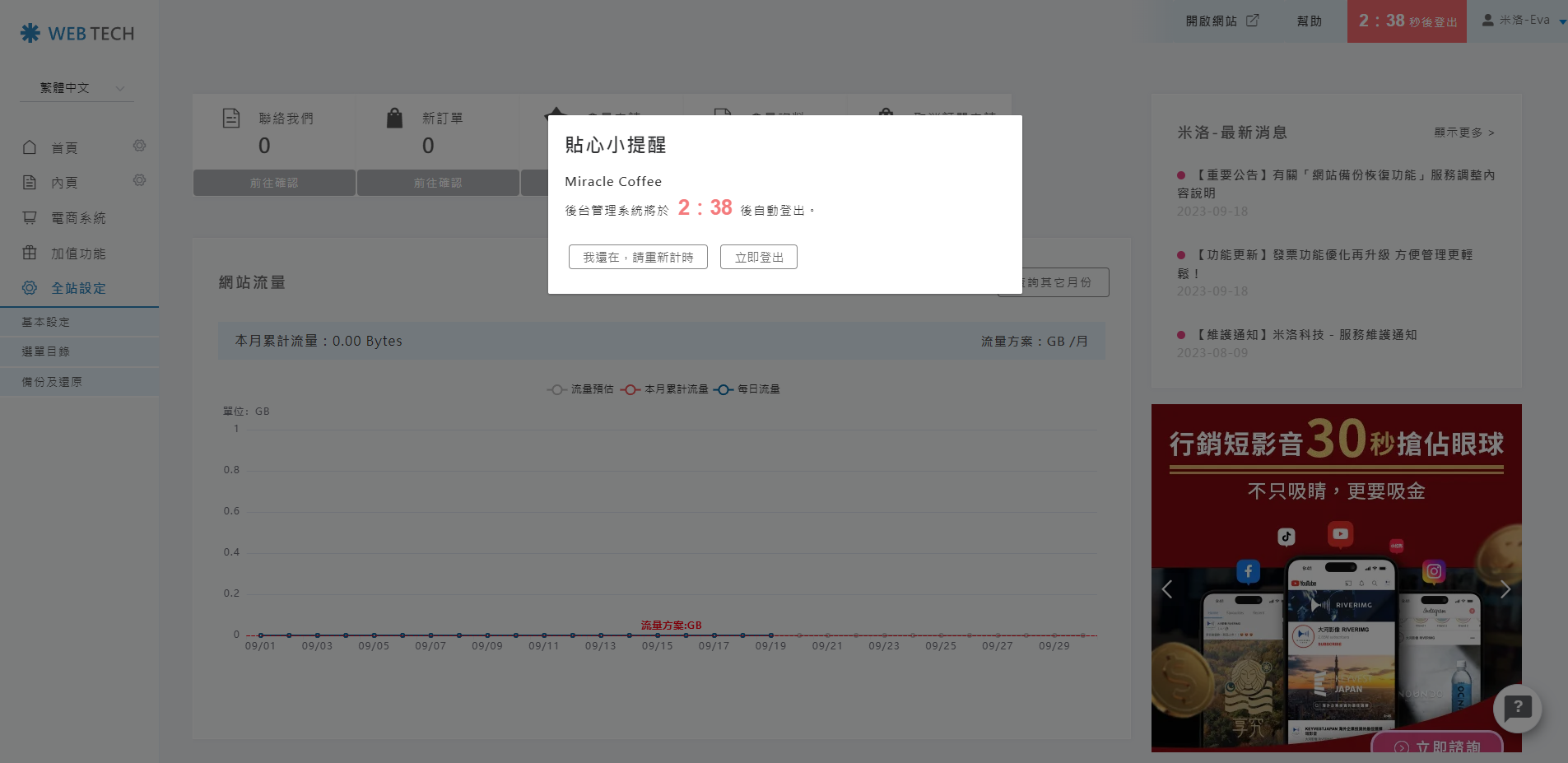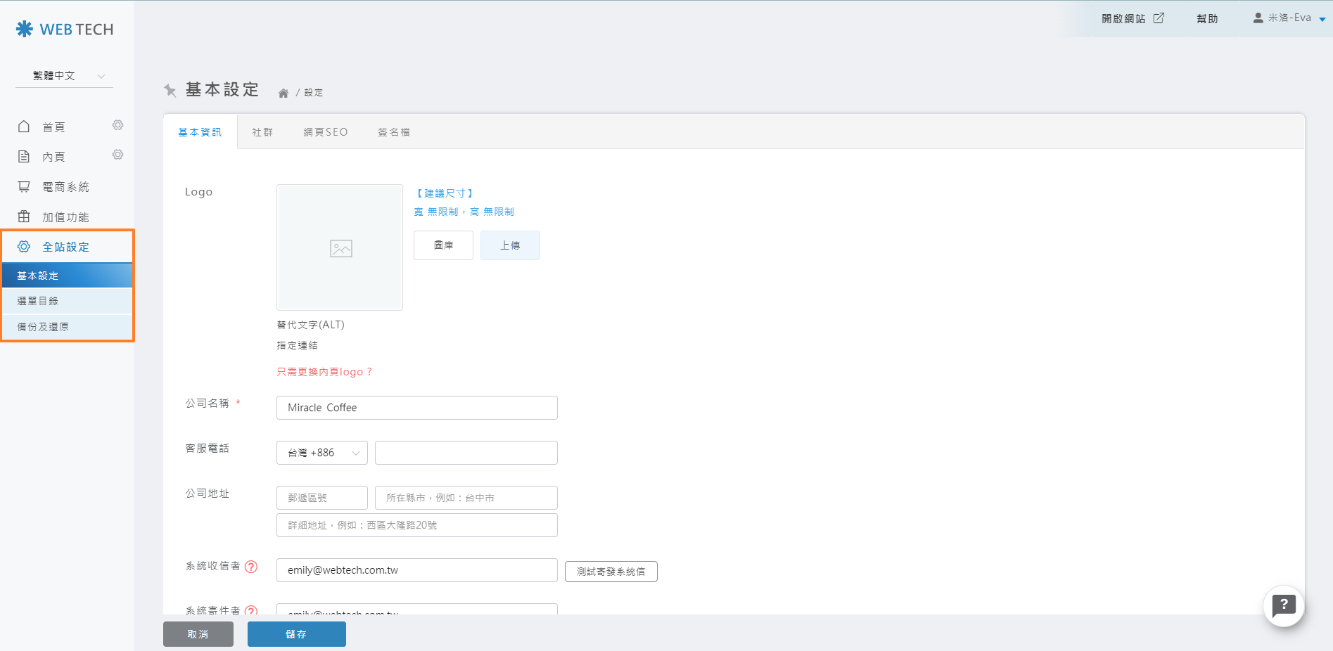 ● 全站設定:主要會是全網站通用性的項目,都是在這裡設定,以下將會介紹「基本設定、選單目錄、備份及還原」