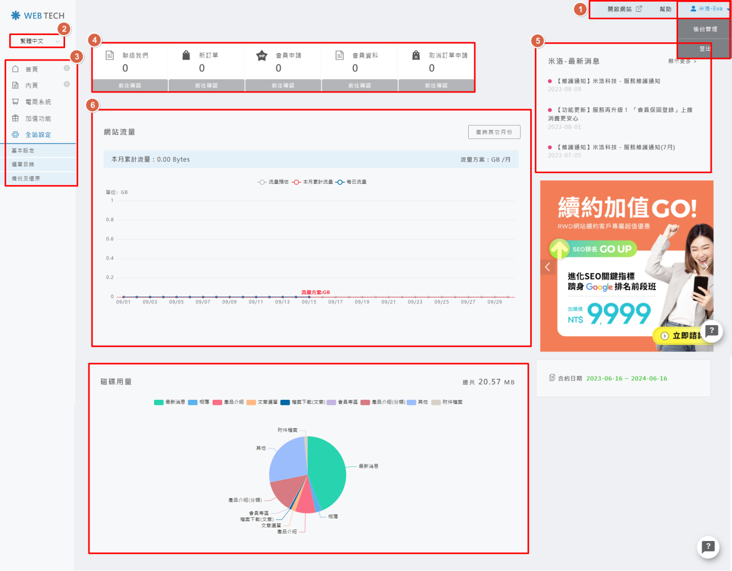 在我們登入後台後,我們可以看到後台首頁畫面如下,總共會分為六個區塊大項: