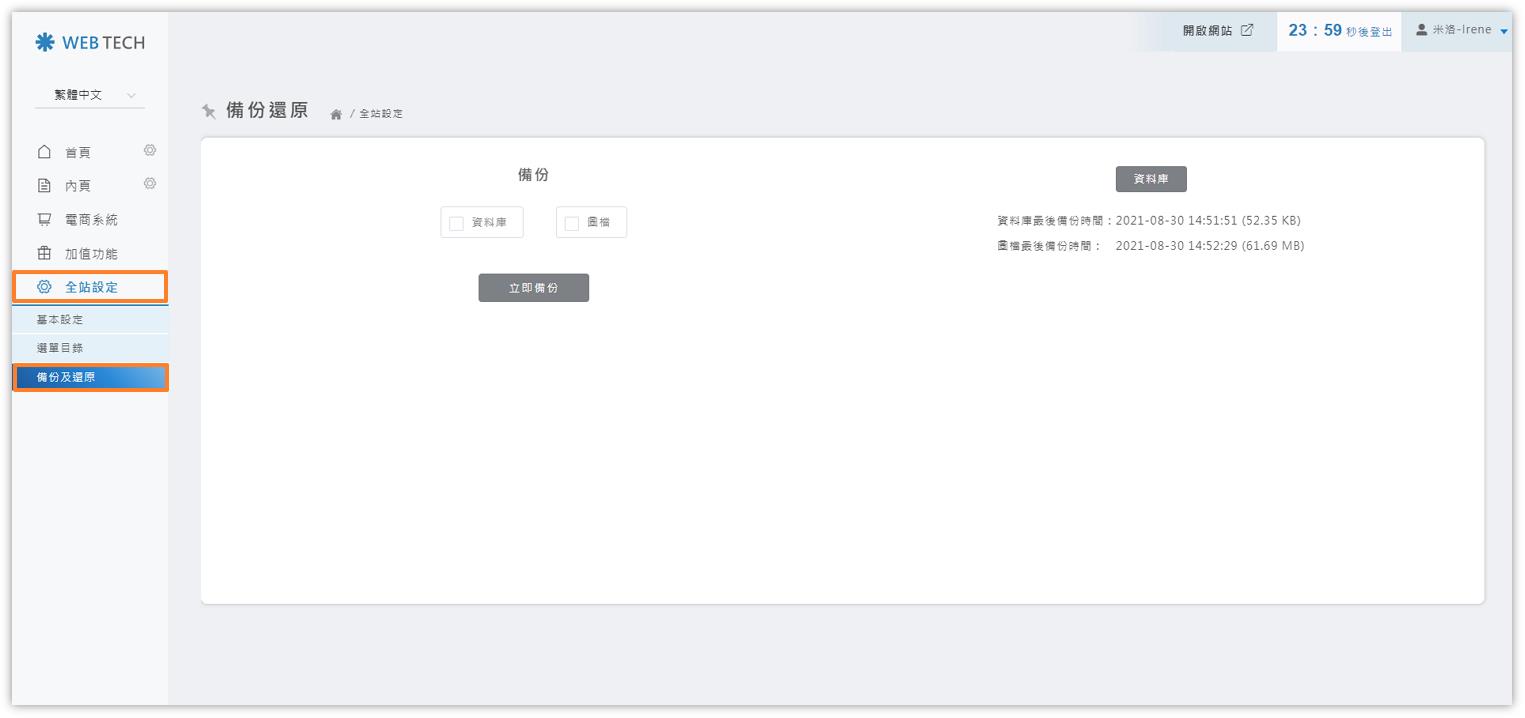 ●若有操作後台,建議您於修改前/後,點選備份,以防編輯時若發生操作異常或失誤時,可以備份還原,也建議您定期備份網站資料。