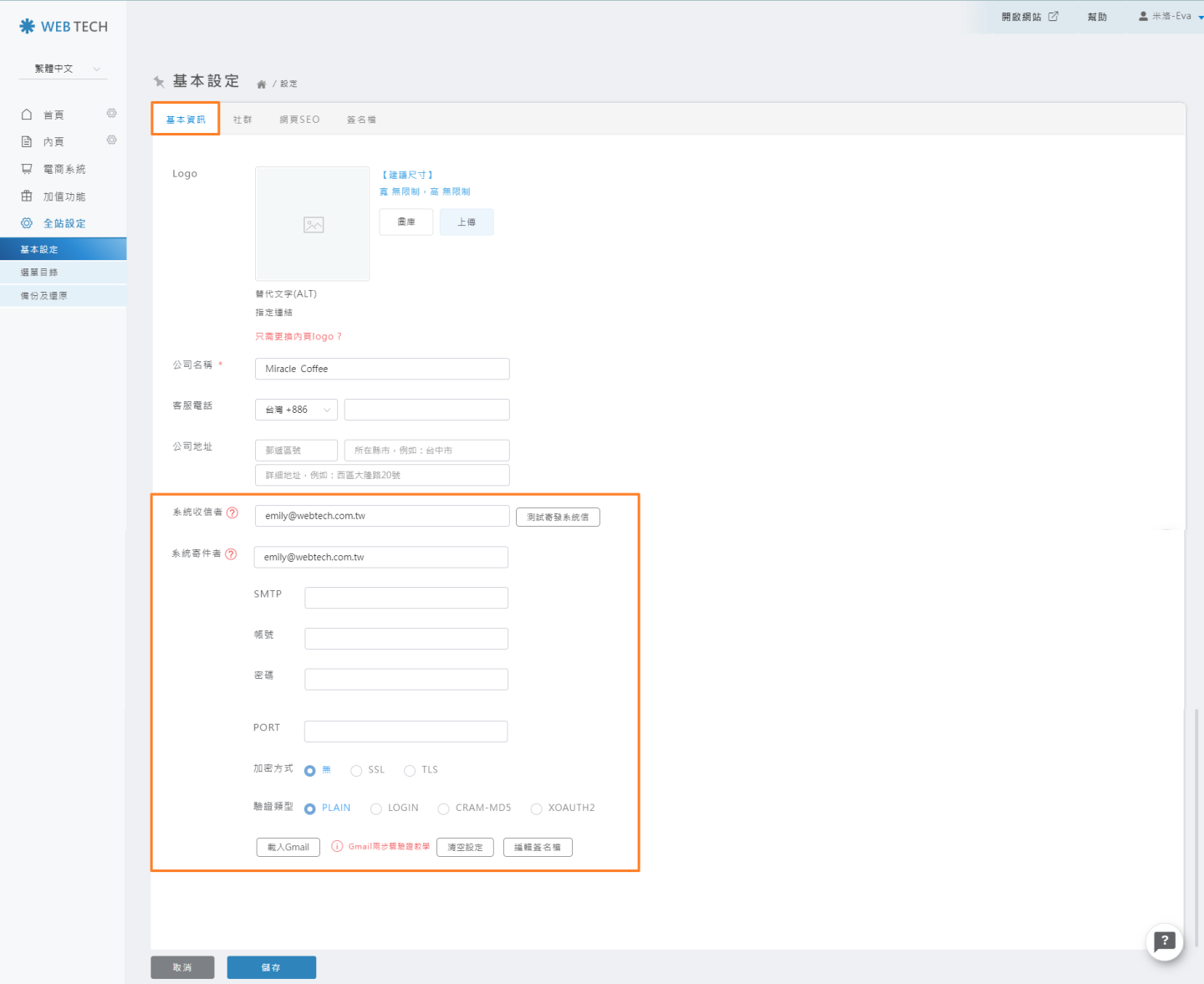 請填入貴公司寄件者email和相關SMTP發信資訊。