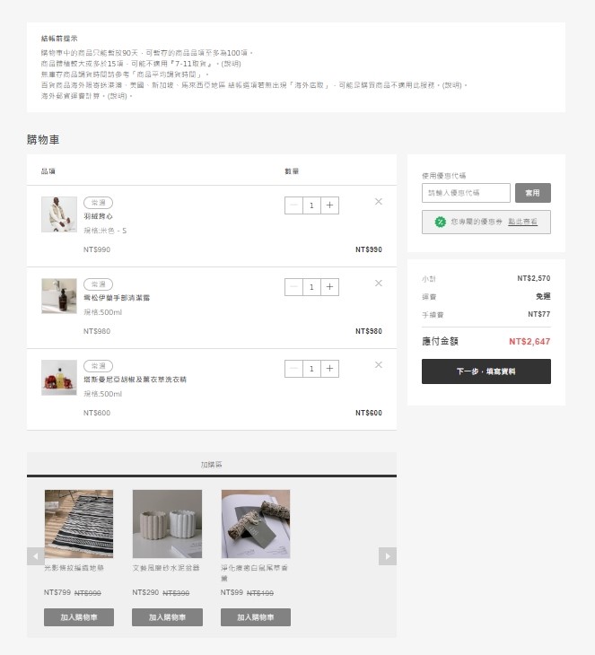 - 某些產品無法選擇相同的運送方式結帳時,未結帳的產品會保留在購物車
