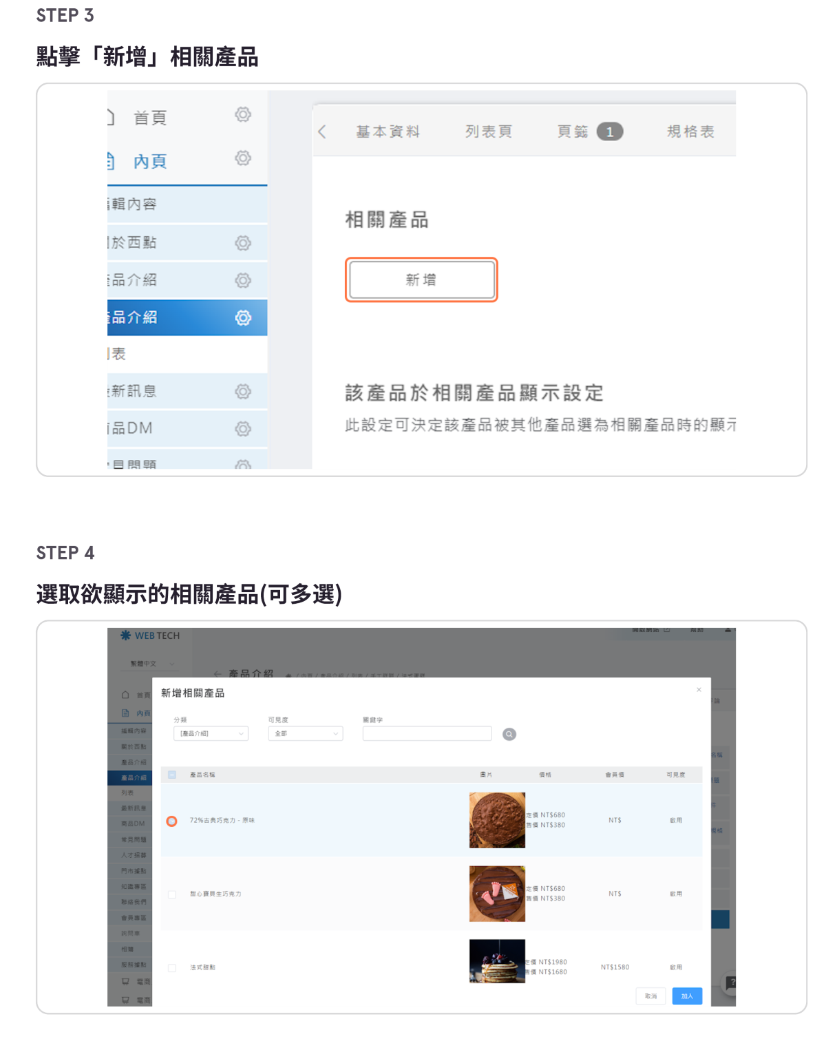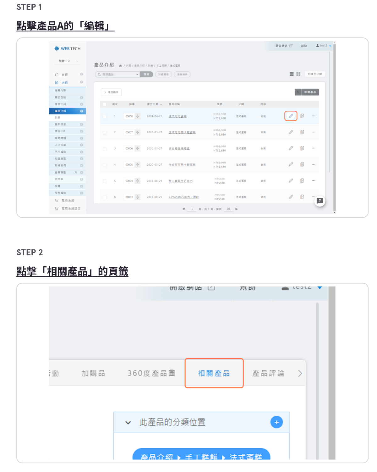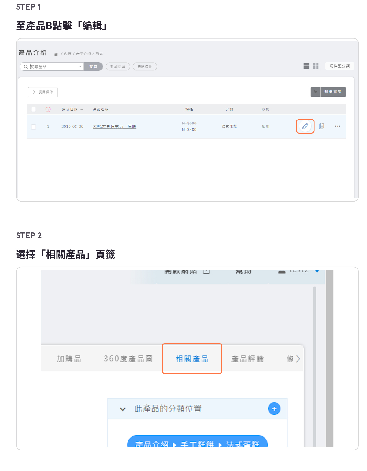 例如:我想要點入產品A的頁面,相關產品部分會出現產品B,這時就可以使用【相關產品】的功能。