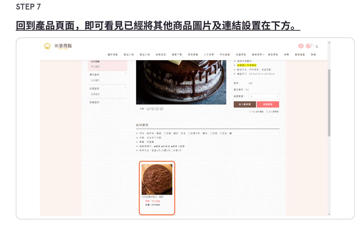 在產品架構中,我們可以設定在產品說明下方出現”推薦產品區”,增加其他產品曝光度及下單機會。