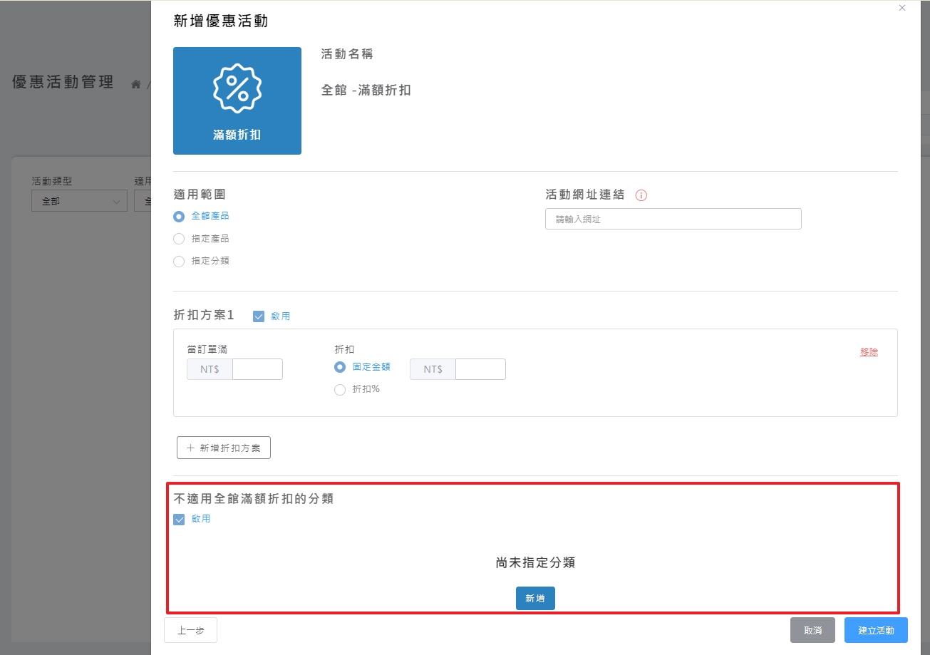 ③ 不適用全館滿額折扣的分類 ( 可排除特定分類 )