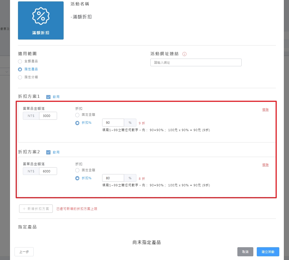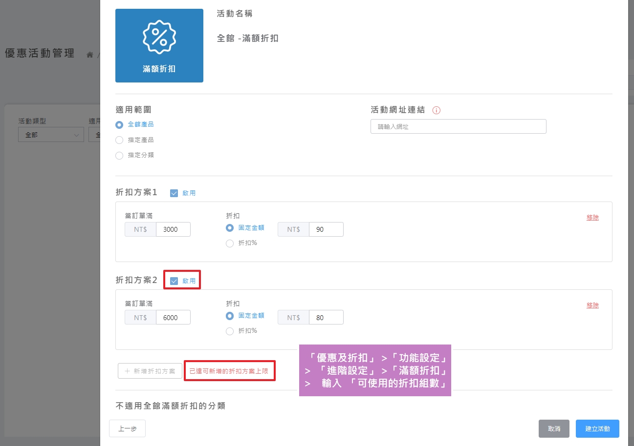 ① 系統預設顯示1組折扣方案,如需設定多組方案,可點選「+新增折扣方案」並在新增的方案勾選☑「啟用」。