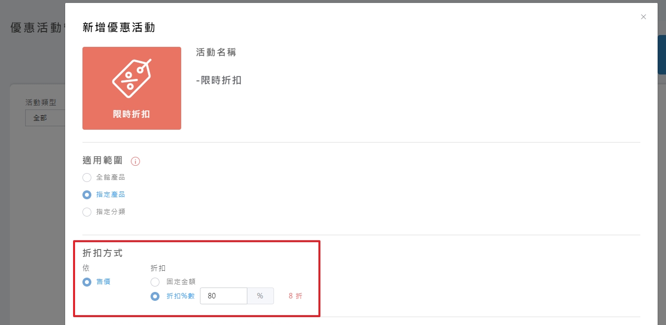 折扣方式:設定折扣「固定金額」或「折扣%數」