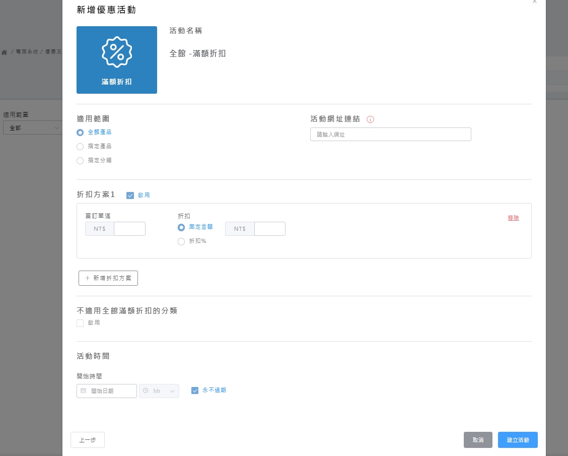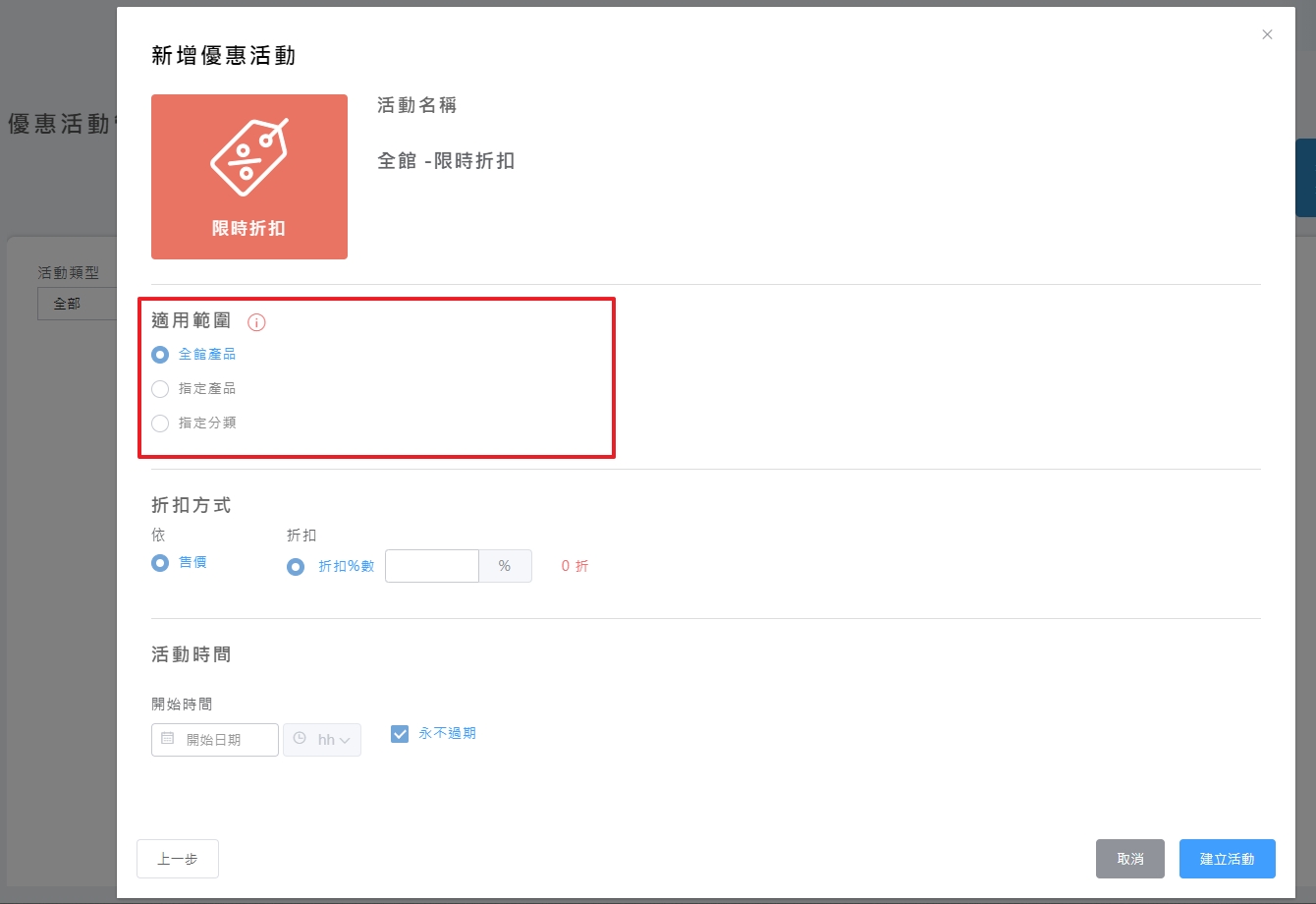 在新增優惠活動視窗中,點選「限時折扣」後點擊「下一步」按鈕