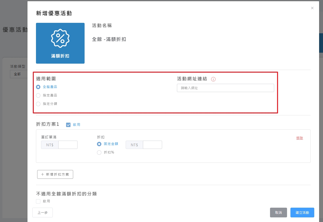選擇「全館產品」後,在下方折扣方式的欄位可設定