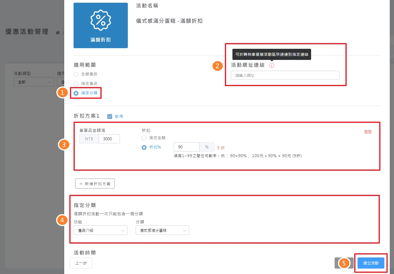 ❖ 指定分類:針對「特定分類內的產品」做折扣 (系統預設不限制購買數量)。