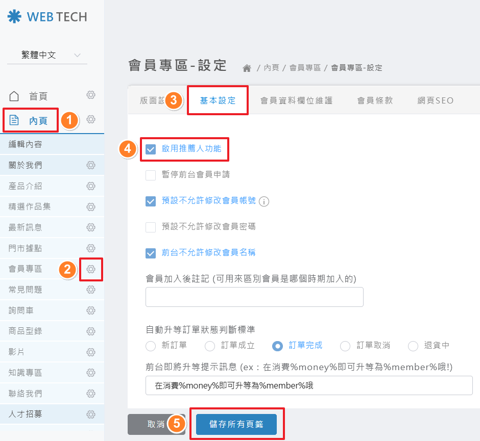 點選「內頁」>「會員專區」旁的設定圖示>「基本設定」> 勾選☑「啟用推薦人功能」> 「儲存所有頁籤」