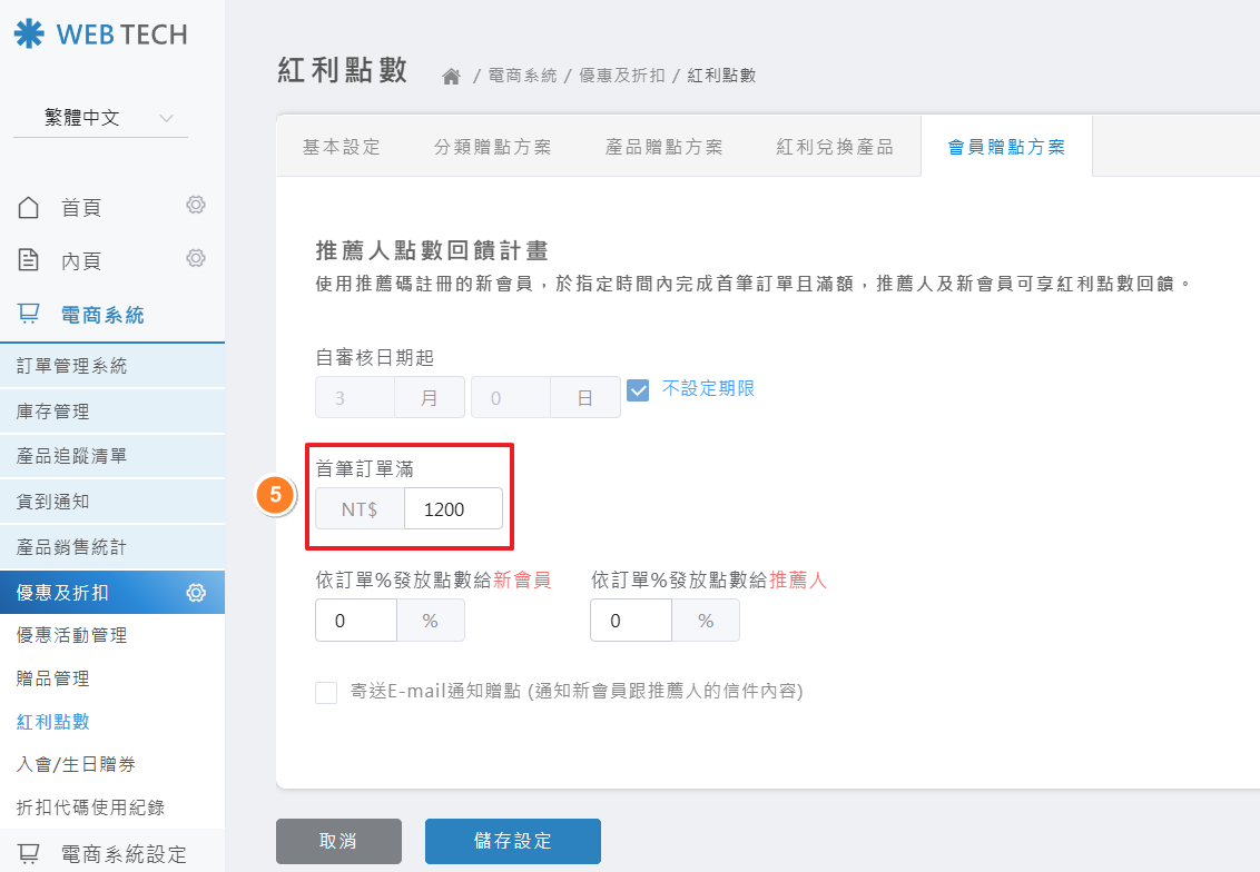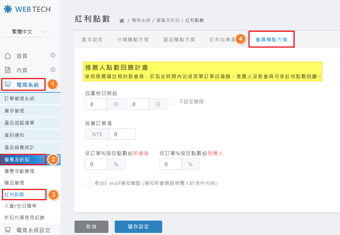 點選「電商系統」>「優惠及折扣」>「紅利點數」>「會員積點方案」> 設定「推薦人點數回饋計畫」