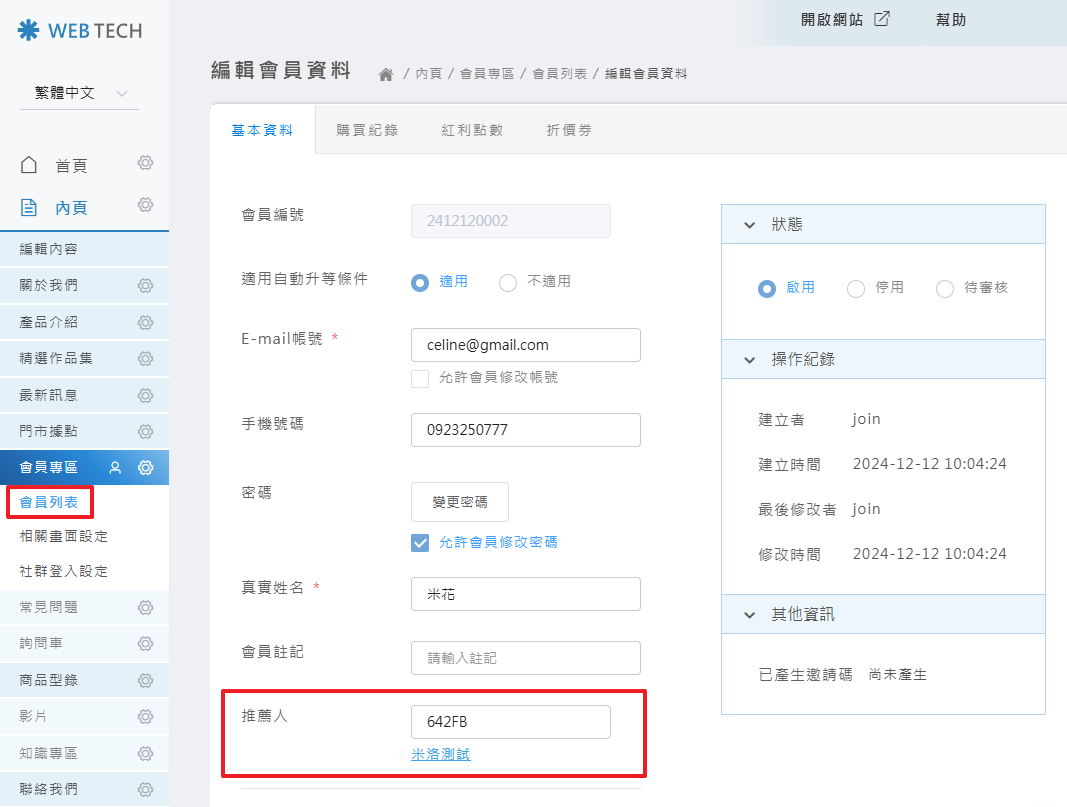在「會員基本資料」內,可以看到推薦人的「推薦碼」以及「會員名稱」。