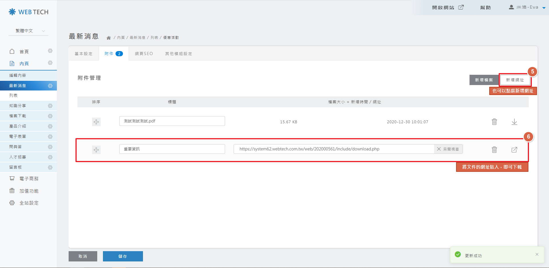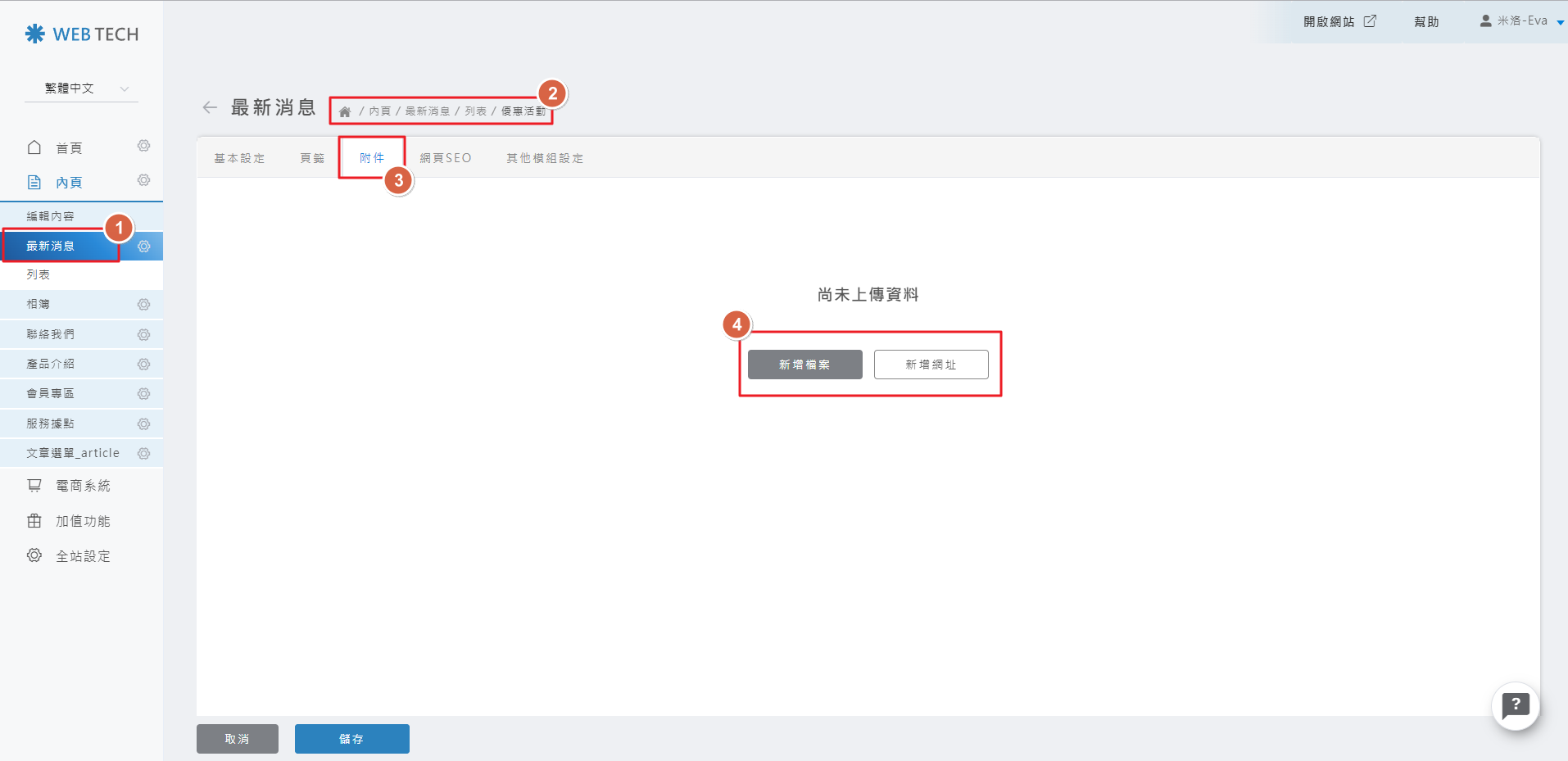 備註:如 貴公司後台,選單【產品】和【文章】頁面無[附件]分頁,可請 貴公司的專屬客服開通
