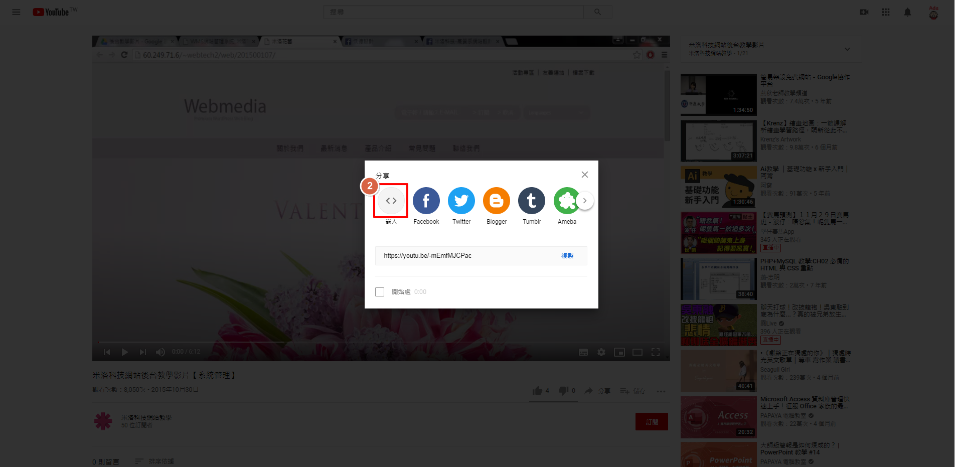 請先到youtube開啟想要崁入在網站的影片,點選「分享」
