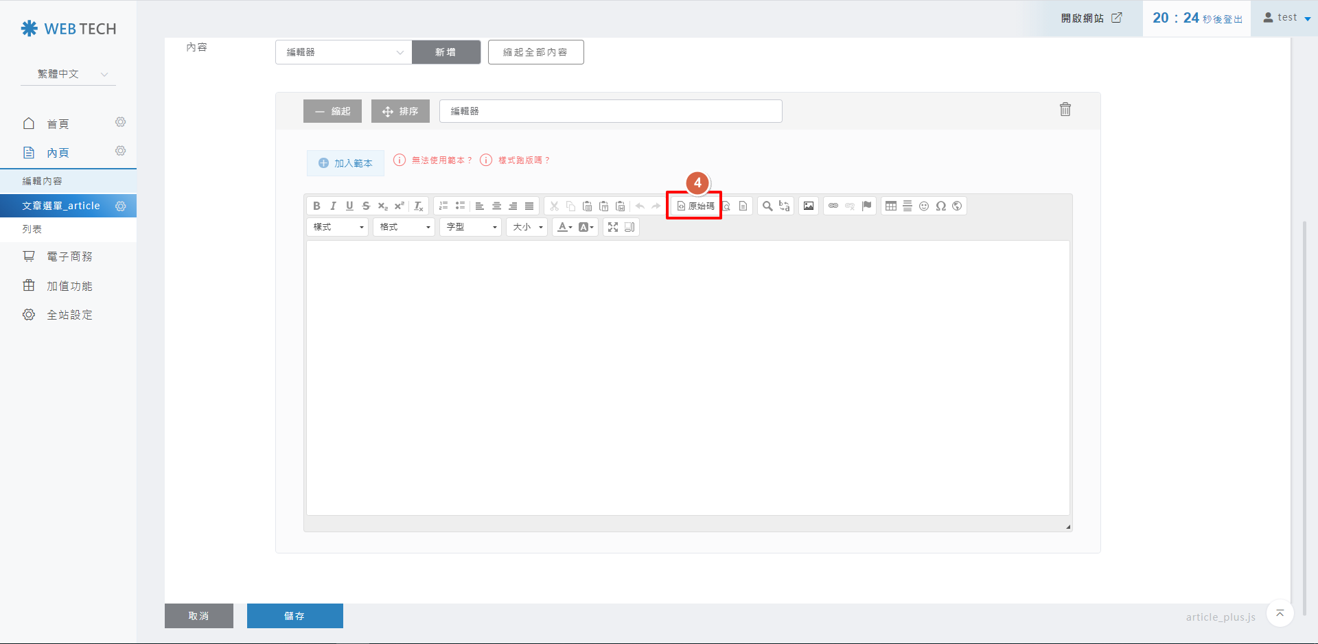 將步驟3複製的原始碼貼在編輯區塊,貼上後再按「原始碼」。