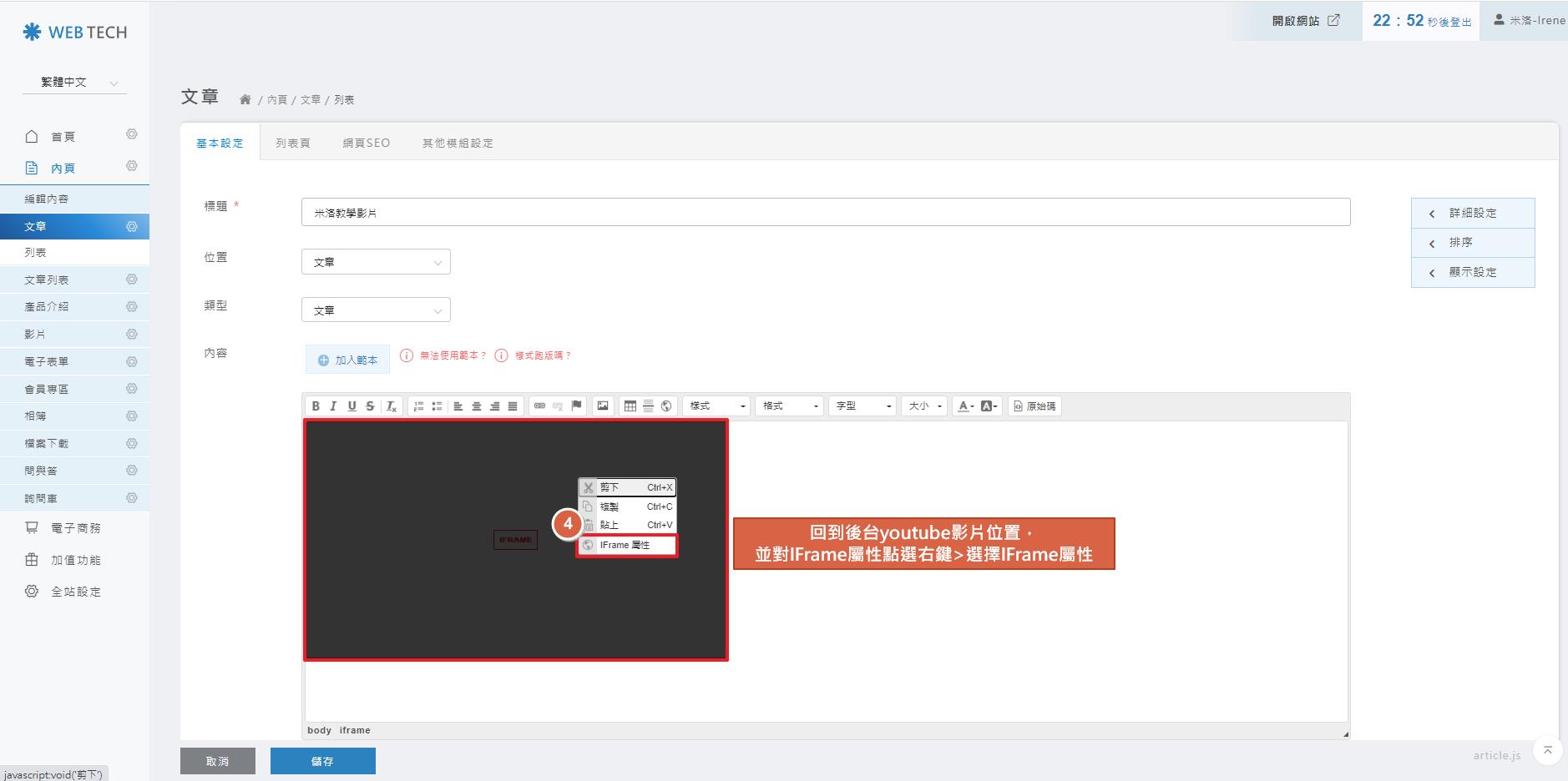 回到後台,並將滑鼠移到要更換的youtube影片,IFRAME的區塊,點擊滑鼠右鍵,選擇IFRAME屬性