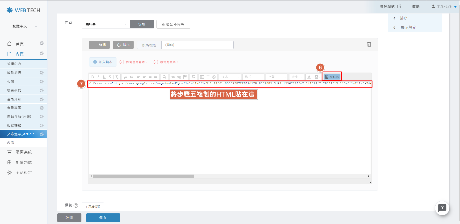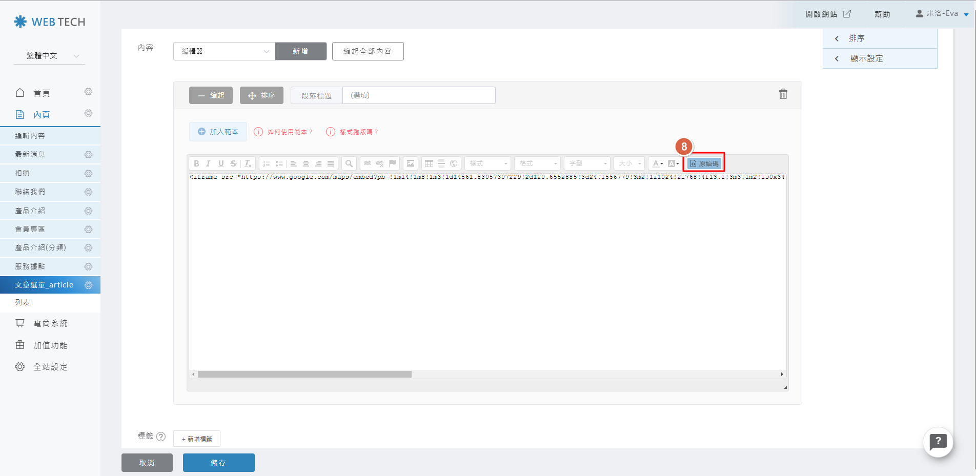 開啟想要崁入google map的後台編輯頁面,點選「原始碼」,將步驟5複製的HTML貼在編輯器區塊。