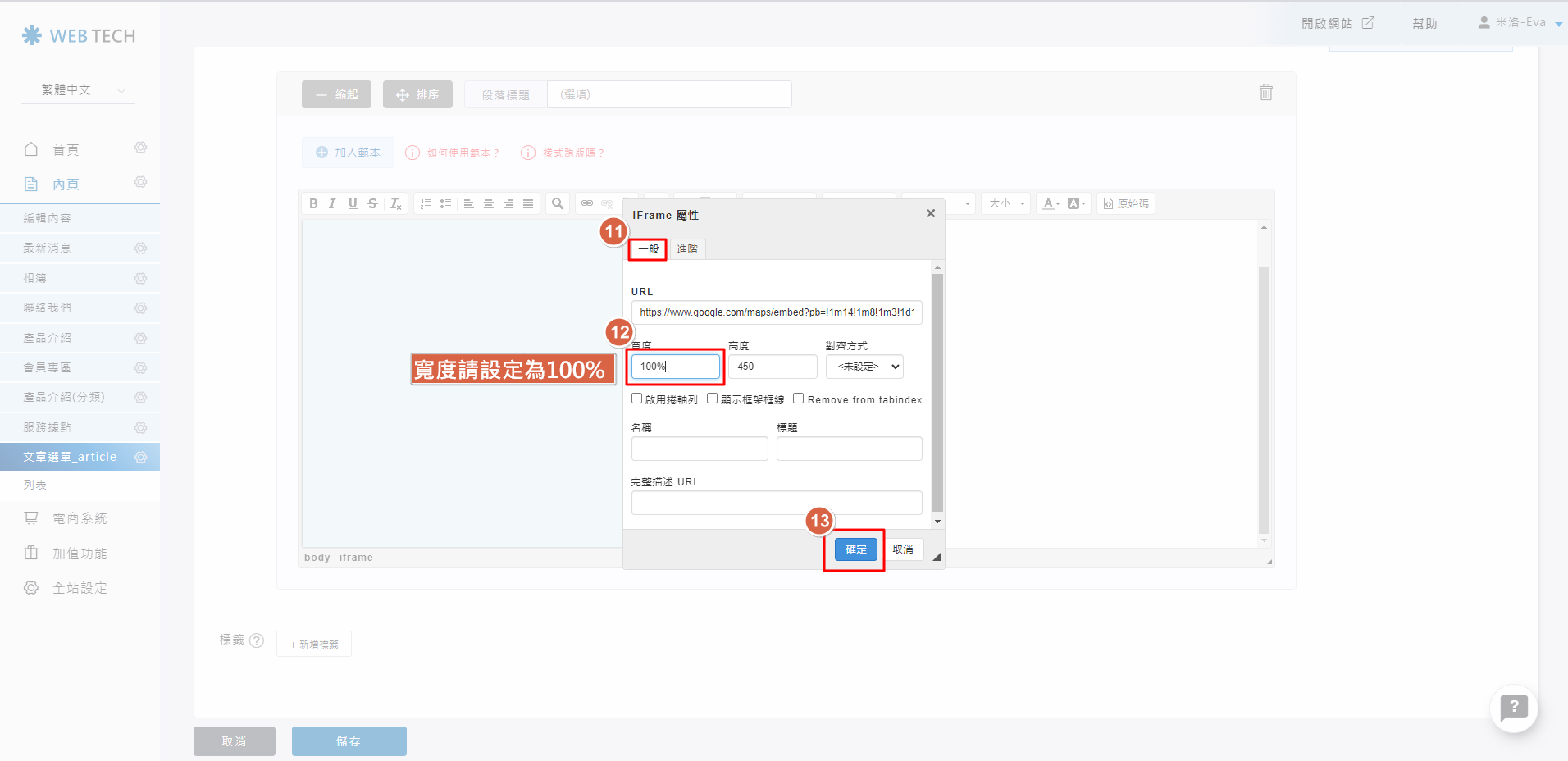 在IFrame屬性的介面點選「一般」,將寬度設定100%,高度依照您的需求填入即可,設定完後請按「確定」。