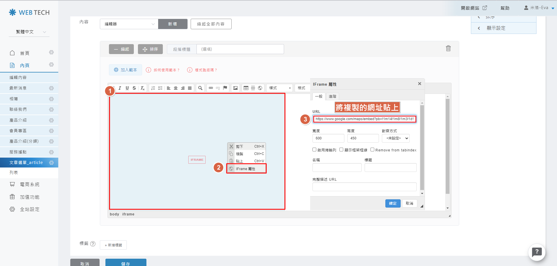 將滑鼠移到IFRAME的區塊,按滑鼠右鍵,點擊「IFrame屬性」,在IFrame屬性的介面將步驟四的網址貼入URL欄位,按確定。。