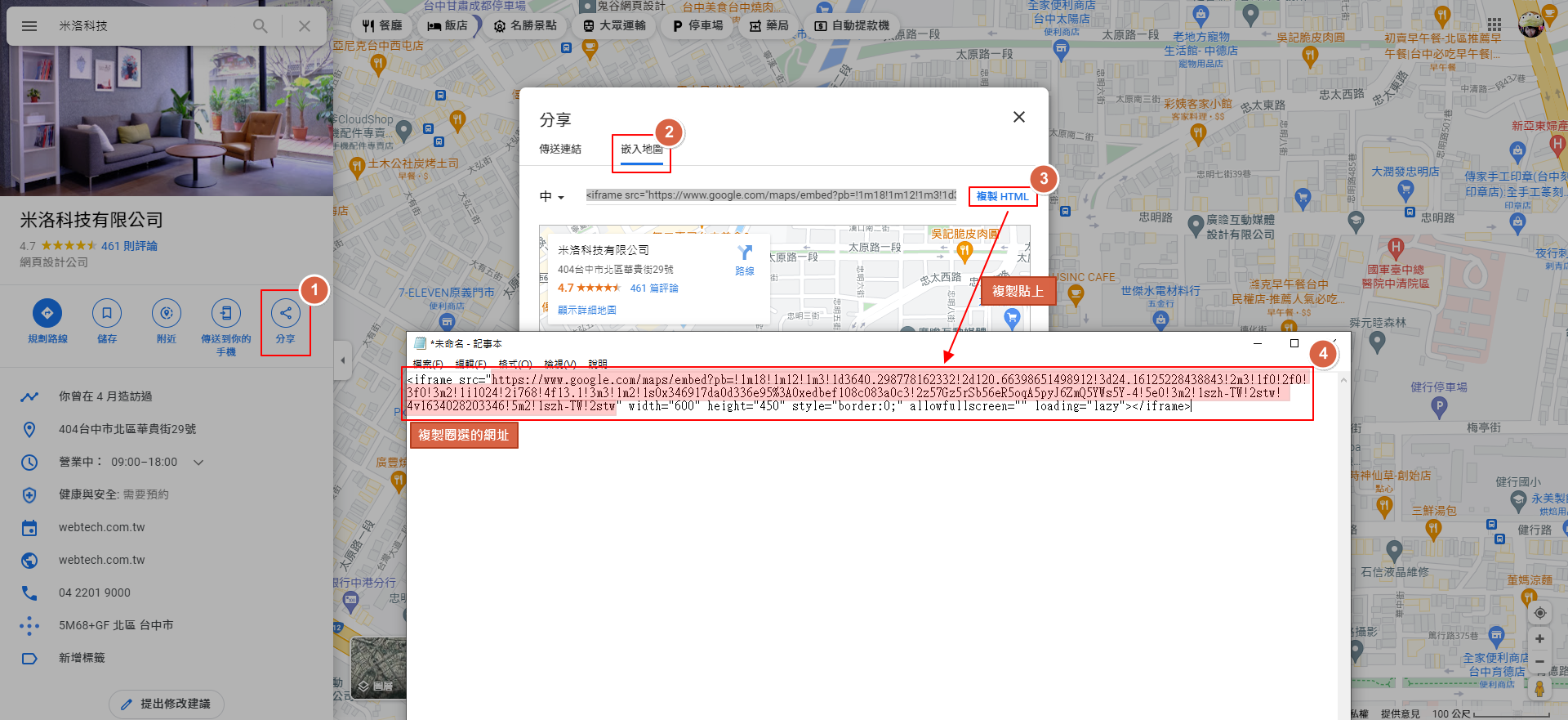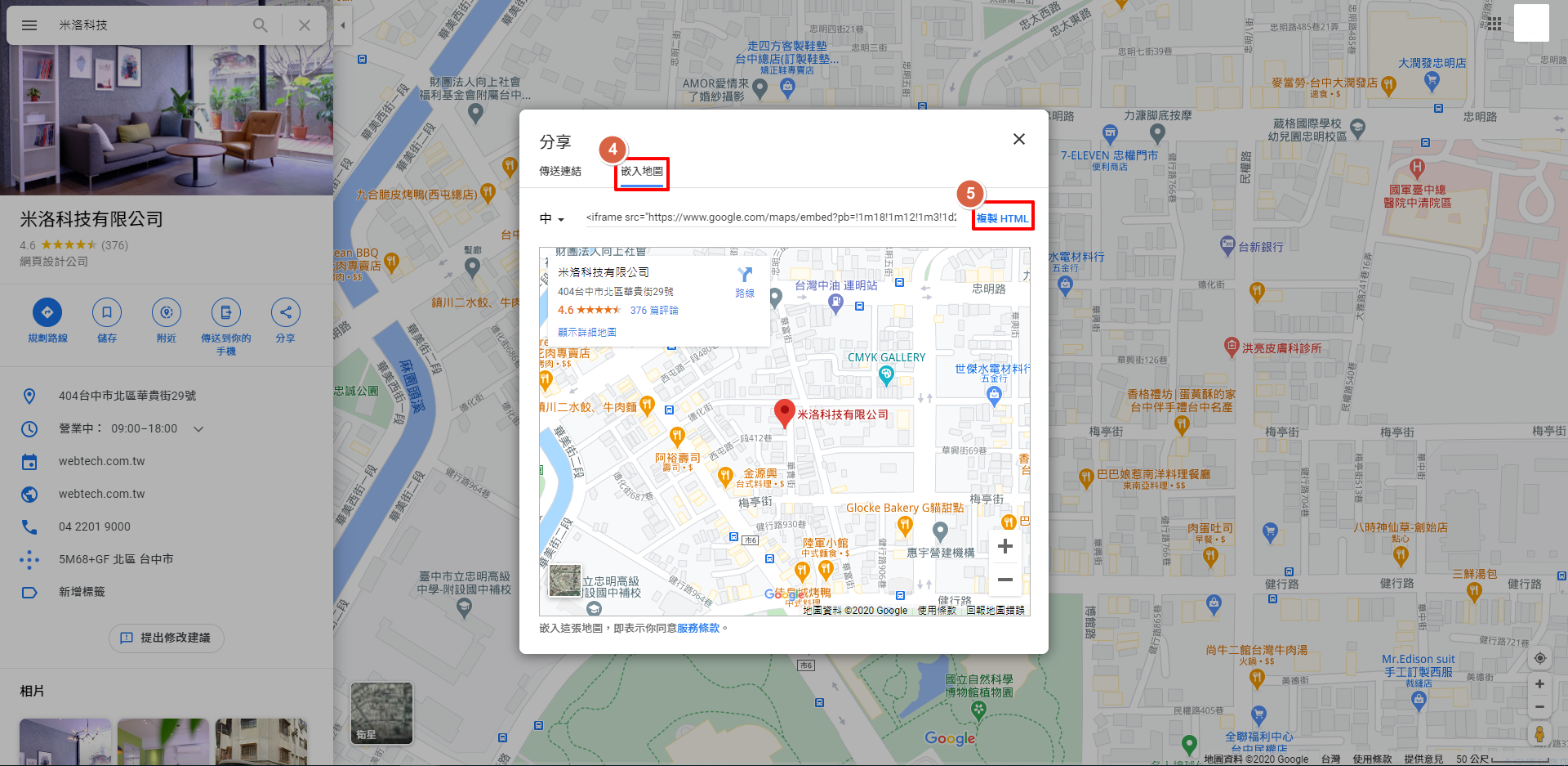 點擊「嵌入地圖」,並點擊「複製HTML」