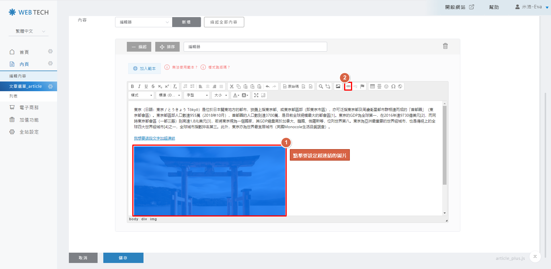 開啟想要編輯的後台頁面,點擊想要設定超連結的圖片,該圖片會反藍,接著再點擊