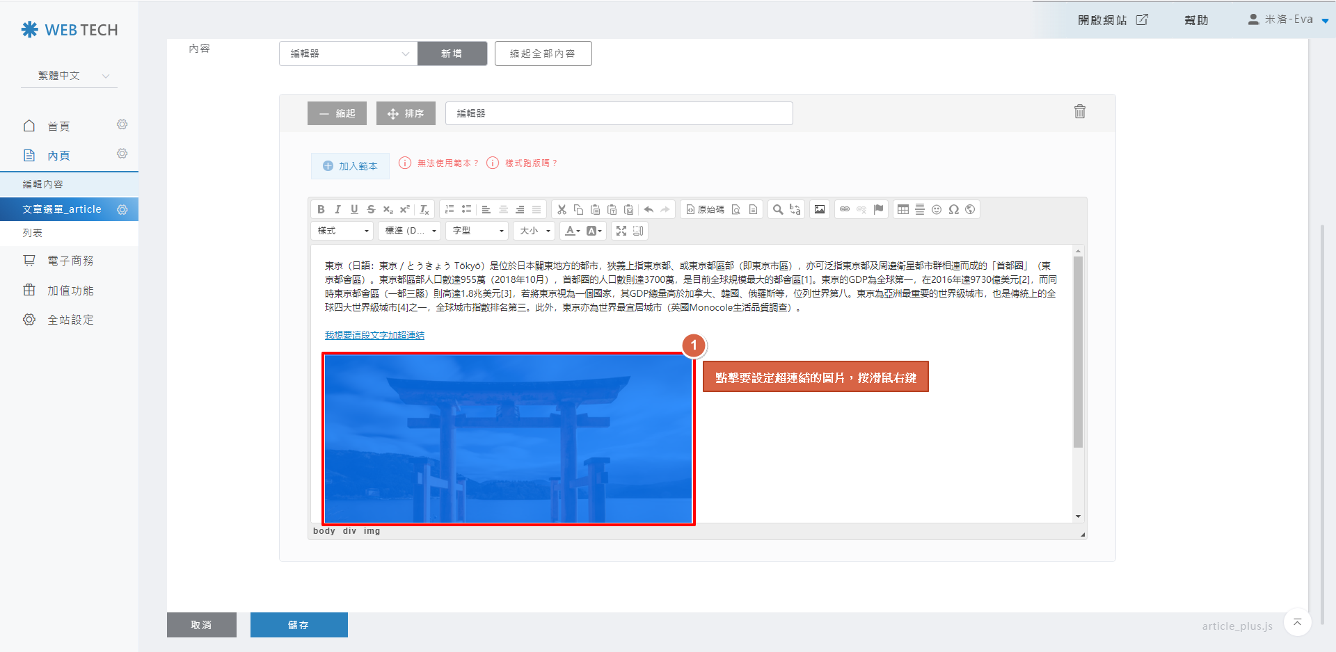 開啟想要編輯的後台頁面,點擊想要設定超連結的圖片,該圖片會反藍,接著再點擊滑鼠右鍵