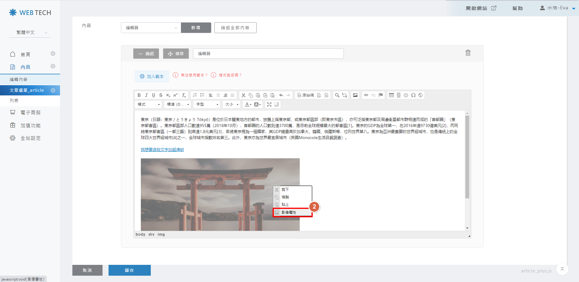 圖片插入到編輯器後,為了讓電腦、平板、手機可以正常瀏覽圖片,請在圖片上點右鍵,並選擇「影像屬性」