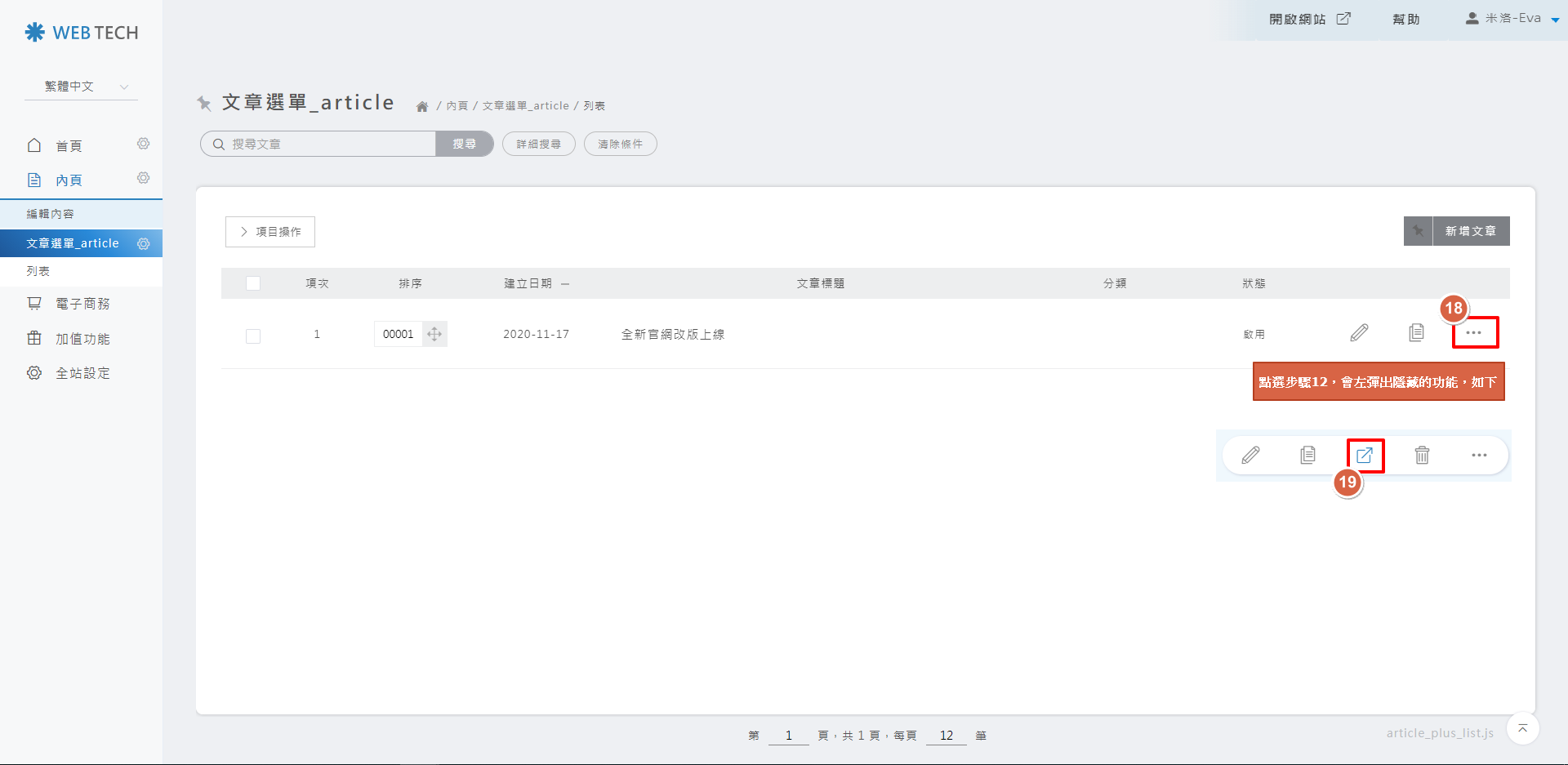 請先點擊「內頁」>「文章選單_article」,在想要上傳檔案的文章項目右後方,點選一枝筆