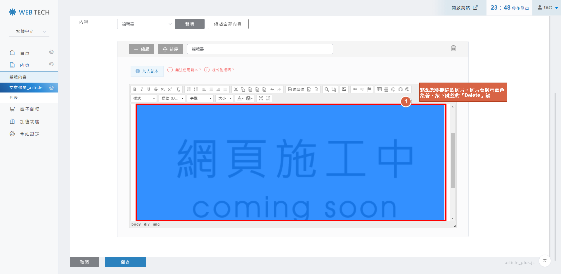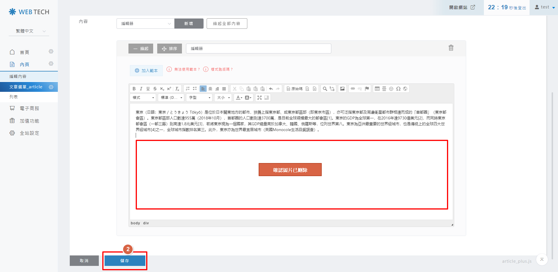 2. 確認文章內容編輯區塊是否有刪除圖片成功,成功刪除後,點擊「儲存」。